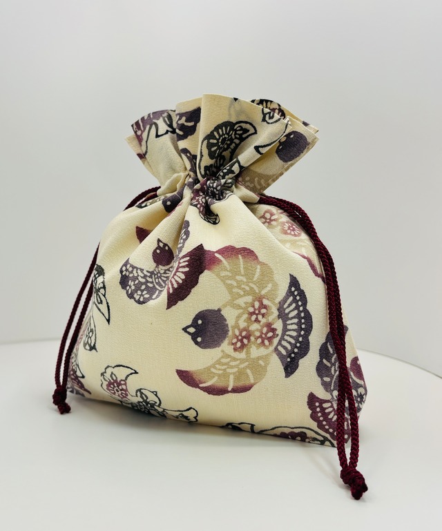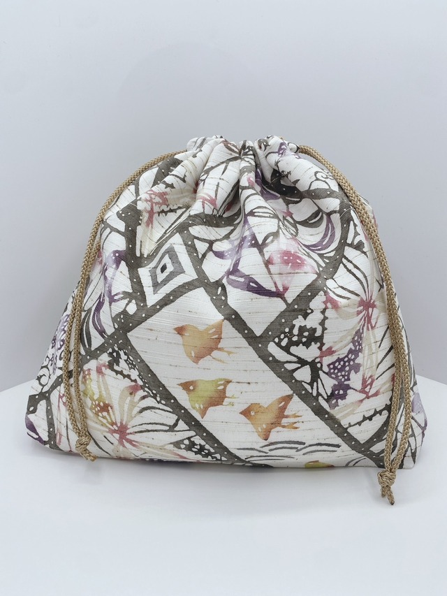 【 手挿し江戸紅型染 巾着 】 手挿し江戸紅型染め巾着、その名は福良雀柄。ふんわり広がる巾着口が、荷物をしっかり包み込みます。 この巾着は、職人が一つ一つ手挿しで染め上げています。そのため、それぞれ微妙に異なる柄の出方が魅力。 世界に一つだけの巾着です。 手触りの柔らかな紬素材は、手持ちの小物を守りながら、上品な印象を与える一品。柄は色豊かで、お気に入りの一つを選ぶ楽しみもあります。 この巾着があれば、日常使いだけでなく、お出かけや旅行時にも大活躍。小さな幸せや大切なものを、しっかりと包んで持ち運んでくれることでしょう。福良雀柄の巾着と共に、幸せや穏やかな気持ちをたくさん詰め込んで、素敵な一日を過ごしてください。 長財布も入る大きさです。 ちょっとしたお出かけに・お散歩のお供に… またはバックインバックとしても活躍してくれます。 ================================== 【サイズ】 幅 29 × 高さ 26 × マチ 4 (cm) *平置き採寸で おおよそのサイズです。 【素材】 表地 ぜんまい紬 裏地 絹紅梅 ▼ お洗濯について▼ 洗濯ネットに入れて手洗いコースで洗濯してください。 洗い終わったら 直ぐに干してください。 ▼ 送料 ▼ 3点以上まとめて(他の商品含め)お買い上げの場合 スマートレター(厚さ2㎝までなので…)は使えませんので、レターパックライト(厚さ3㎝まで) or レターパックプラスを選択してください。 わからない時はお問い合わせください。 ▼ 商品画像について▼ ※実際の商品と仕様、加工、サイズが若干異なる場合がございます。 ※パソコンなどの環境により、若干製品と画像のカラーが異なる場合もございます。