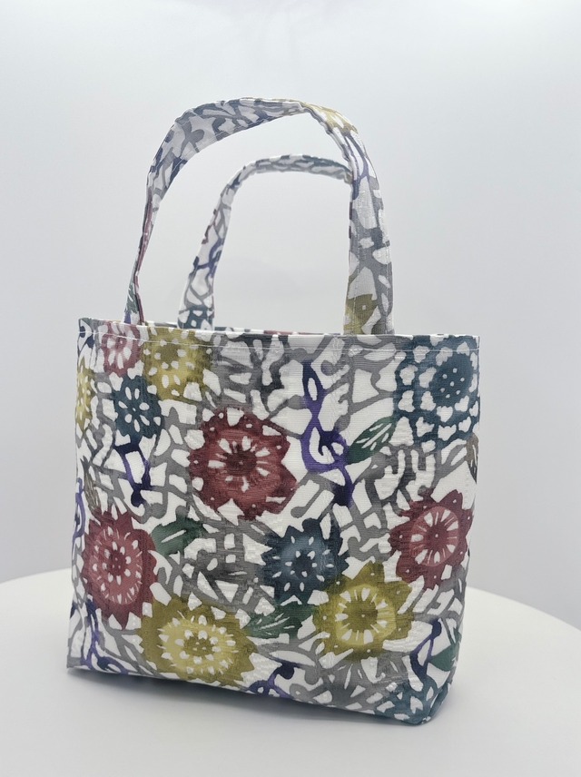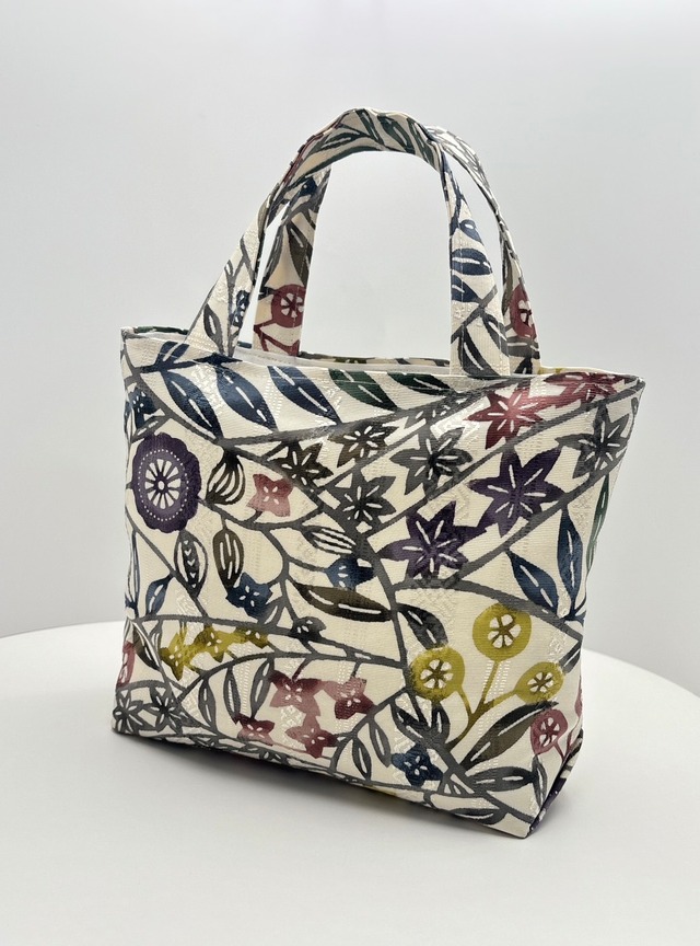 【手挿し江戸紅型染 手提げバッグ】 手挿し江戸紅型染で仕立てられた、ひときわ目を引く手提げバッグです! この美しいバッグは、博多献上帯地を使用し、更紗調の柄が特徴で、陽気な印象の配色が魅力的です。 自立して立つ形状は実用的で、しっかりとした作りながら、持つ楽しさを与えてくれます。マチがあることで、収納力も抜群!お出かけやお買い物はもちろん、特別な日のおしゃれにもおすすめです。この手提げバッグで、あなたのスタイルに華やかさをプラスしませんか? 一緒に出かけると、持つだけで気分も明るくなること間違いなし。自分用はもちろん、大切な方へのプレゼントにもぴったりです。このバッグを使うことで、毎日のコーディネートに楽しさが広がります! 送らせていただく時は 畳んで発送いたします。 ================================== 【サイズ】 幅 28 × 高さ 19(㎝) 持ち手 10(㎝) マチ 7.5 (cm) ※ 平置き採寸で おおよそのサイズです。 【素材】 本体 博多献上帯地 ▼ お洗濯について▼ 洗濯できません どうしても洗いたいときは 中性洗剤を薄めたものをタオルに含ませてバックにタオルを入れてから叩いてください。 その後に綺麗な水を含ませたタオルで叩いて乾燥してください。 ▼送料▼ レターパックプラスを選択してください。 折りたたまない発送をご希望の方、 日時指定をご希望の方は佐川急便を選択してください。 ▼ 商品画像について▼ ※実際の商品と仕様、加工、サイズが若干異なる場合がございます。 ※パソコンなどの環境により、若干製品と画像のカラーが異なる場合もございます。