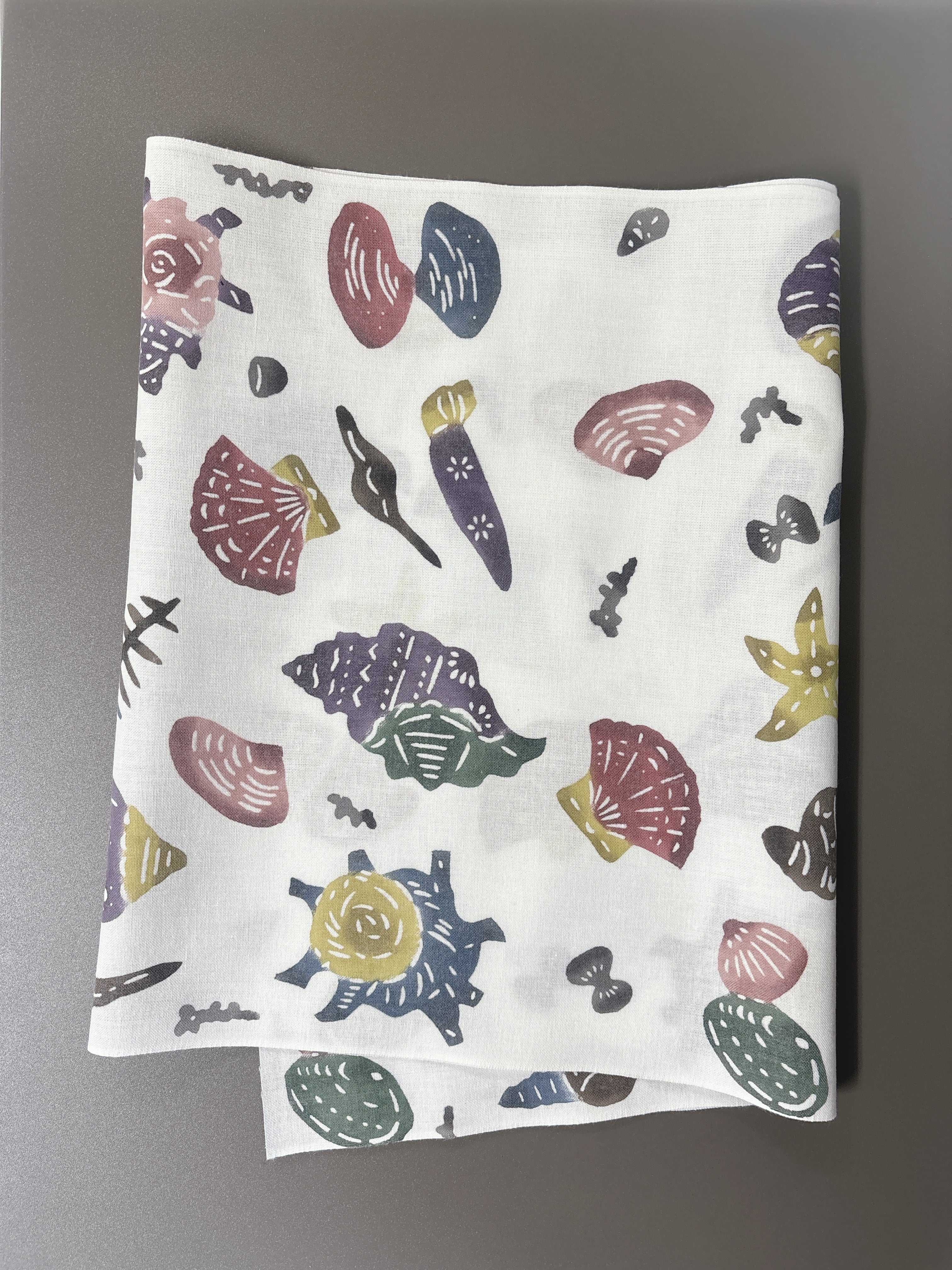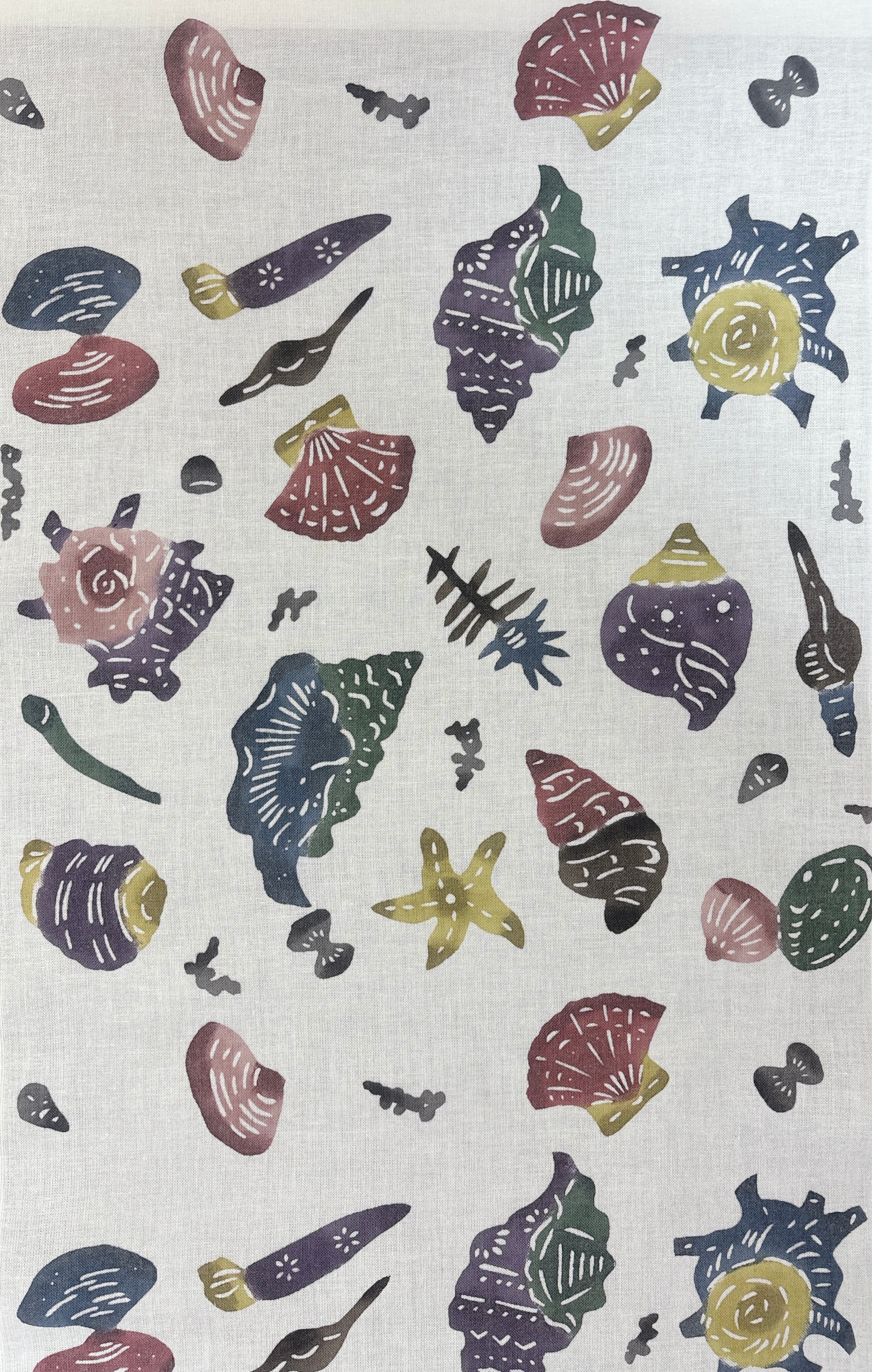 手挿し江戸紅型染めで仕上げられた、貝殻の柄が印象的な手拭いです!綿100%の素材を使用しているため、肌触りが柔らかく、日常的に使うのが楽しくなるアイテムです。色とりどりの配色が魅力的で、使うほどに風合いが深まるのが特徴です。