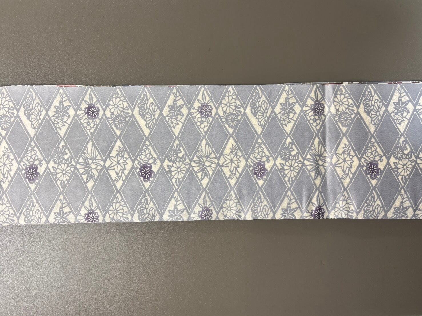 この半幅帯は、古典柄を色豊かに使用した配色で、華やかな印象を与えます。もう一面は、銀色に近い色合いで染めた後、薄紫を色挿ししており、異なる表情を楽しむことができます。