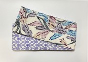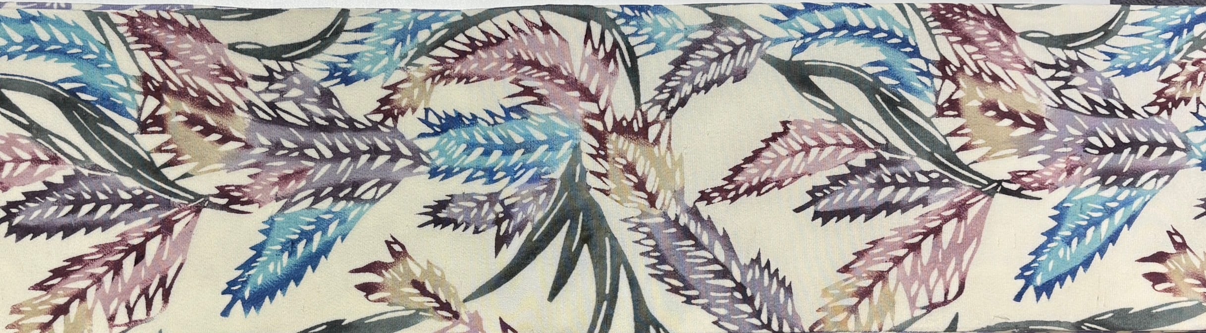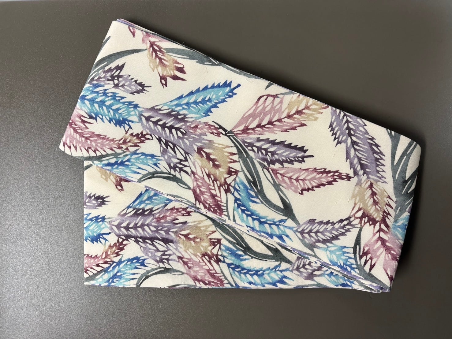 この半幅帯は、一面に葉の柄をパステル調の柔らかな配色で仕上げており、もう一面は薄青紫で染めた後、ぼかしを施したデザインが特徴です。両面異なる表情を楽しむことができ、どんなシーンにも華やかさを添えてくれます。