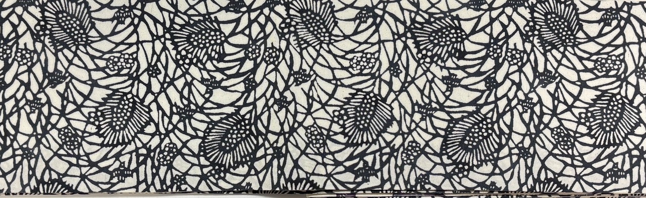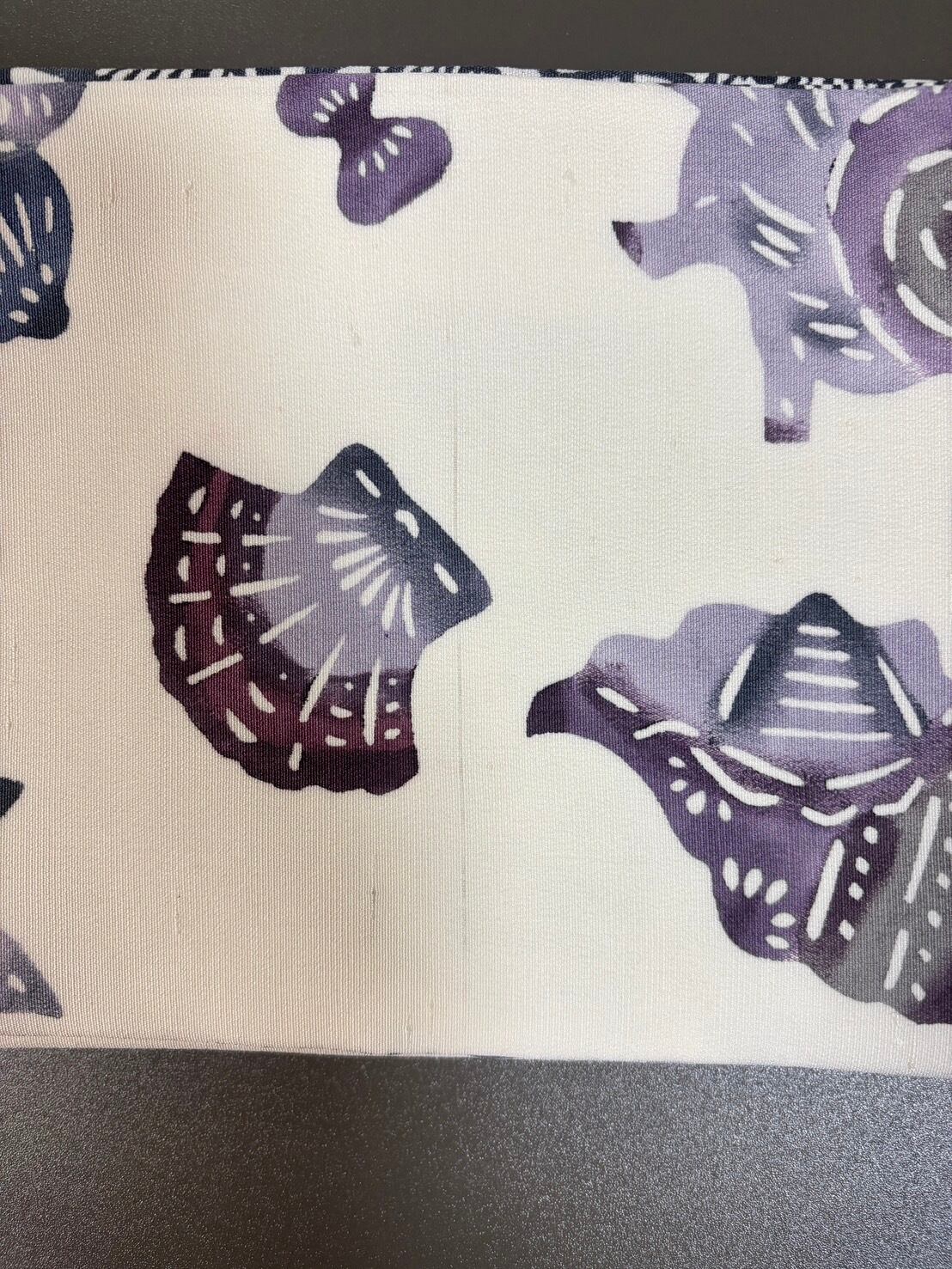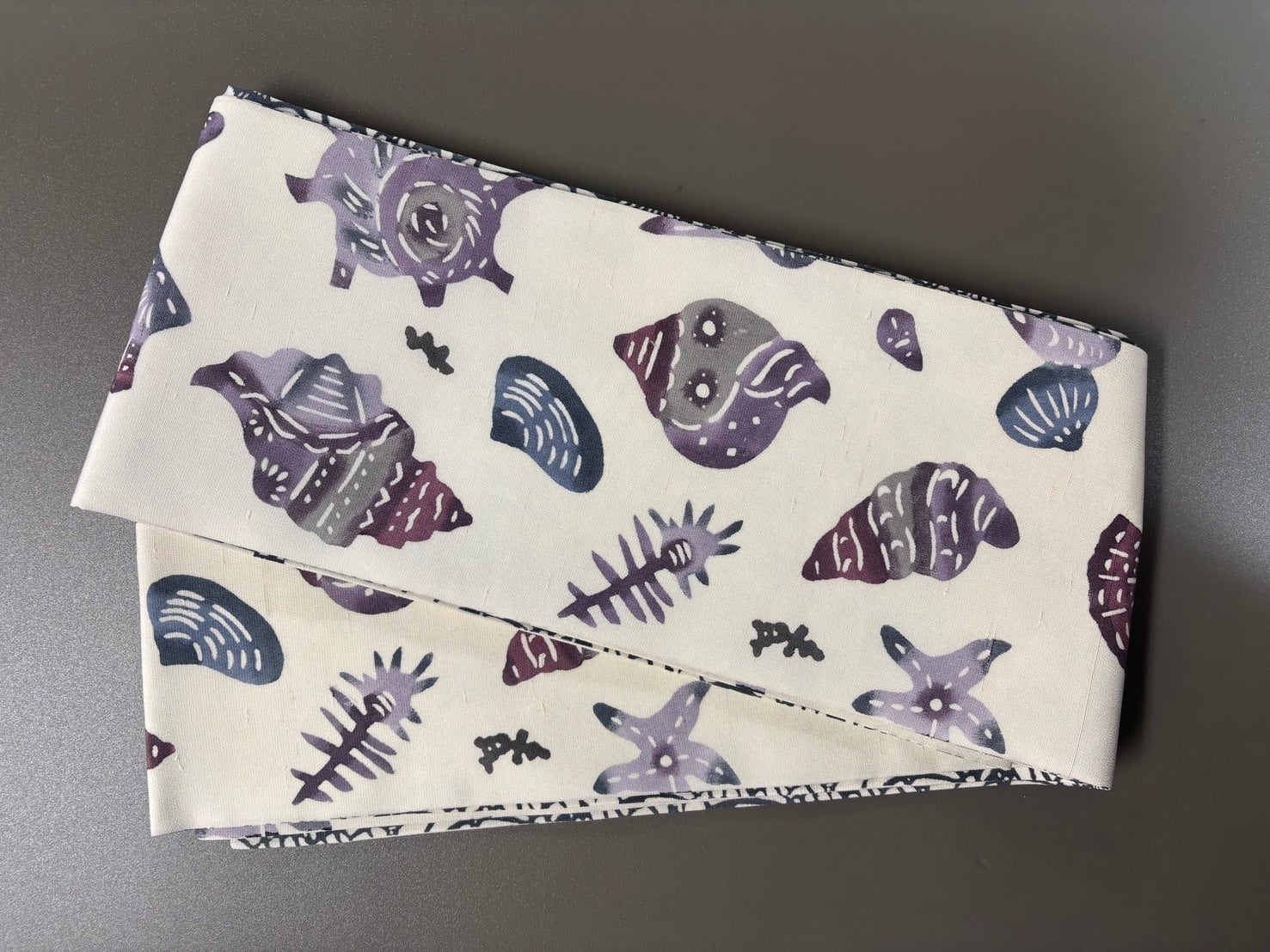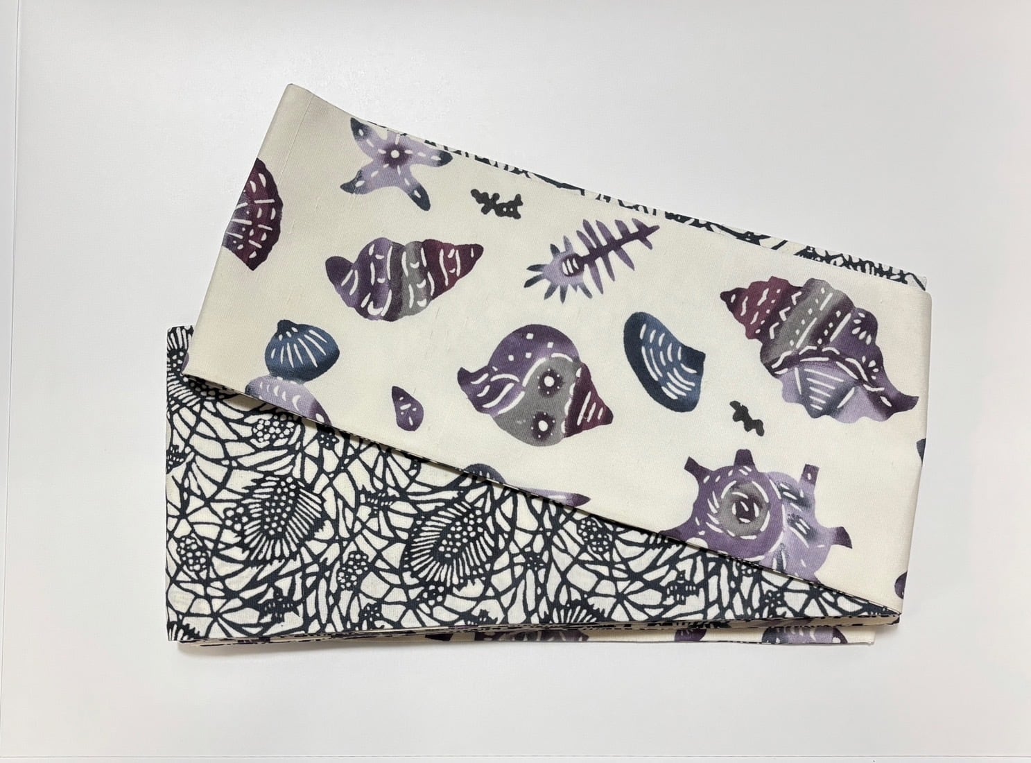 この半幅帯は、一面に貝の柄をシックな色合いで表現し、もう一面は墨色に染めた小さめの柄が印象的です。それぞれ異なるデザインが施されており、手作業による風合いが感じられる特別なアイテムです。織りに難があるものの、それがまた個性を引き立てています。