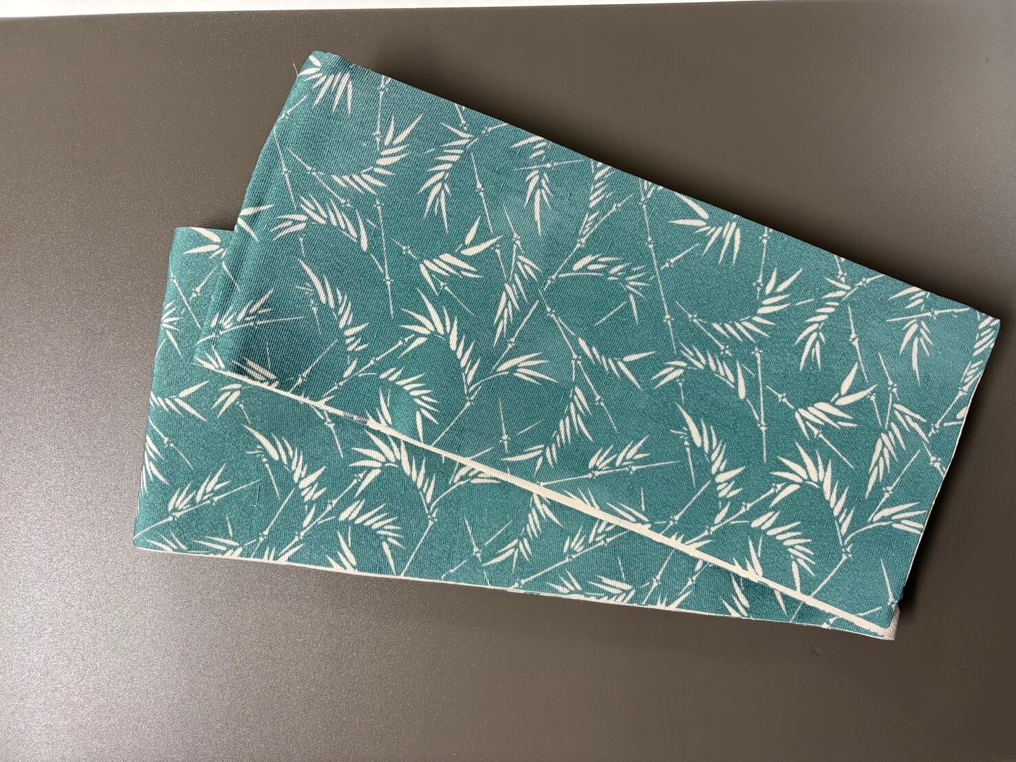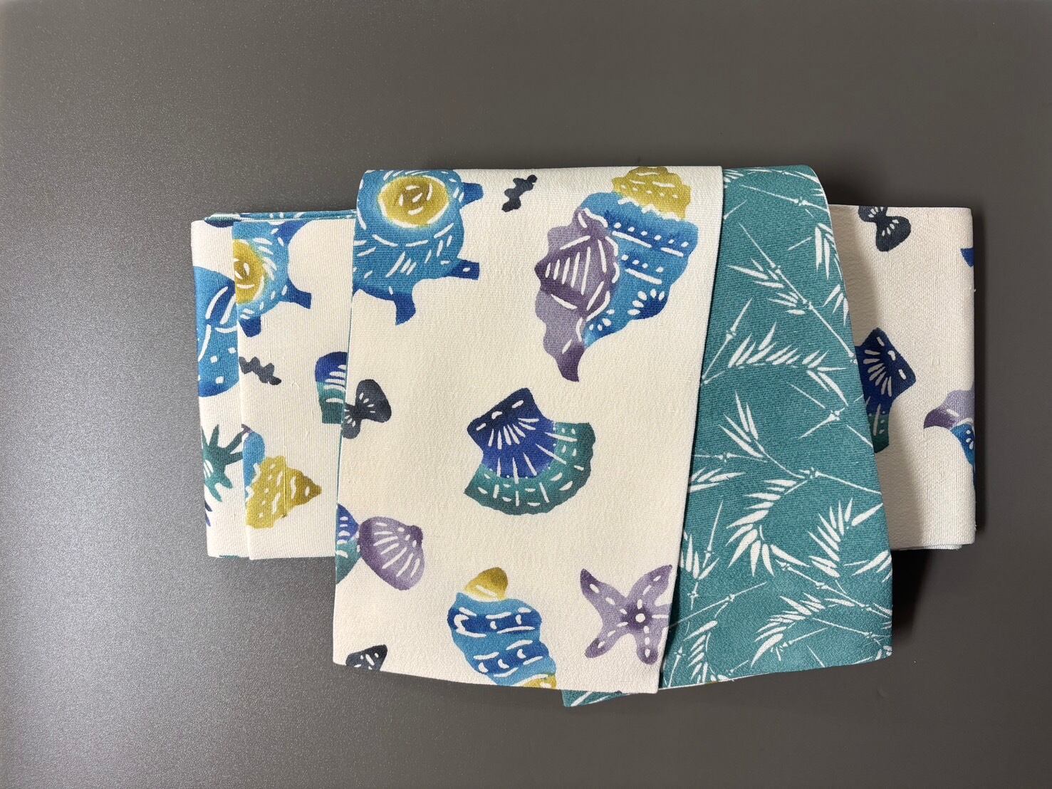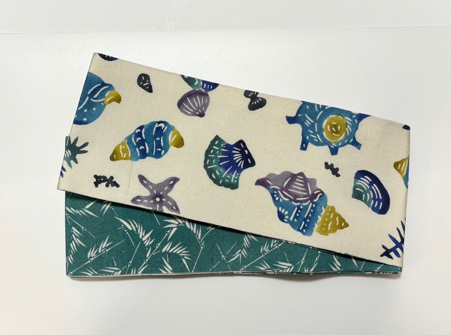 この半幅帯は、一面に貝の柄をさわやかな配色で施し、もう一面はエメラルドグリーンに細かい葉柄が印象的なデザインに仕上げられています。手作業による独特の風合いが感じられる特別なアイテムです。仕立ての美しさだけでなく、思わず手に取ってみたくなる個性を引き立てています。 織りに難があるものの、それがまた個性を引き立てています。