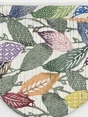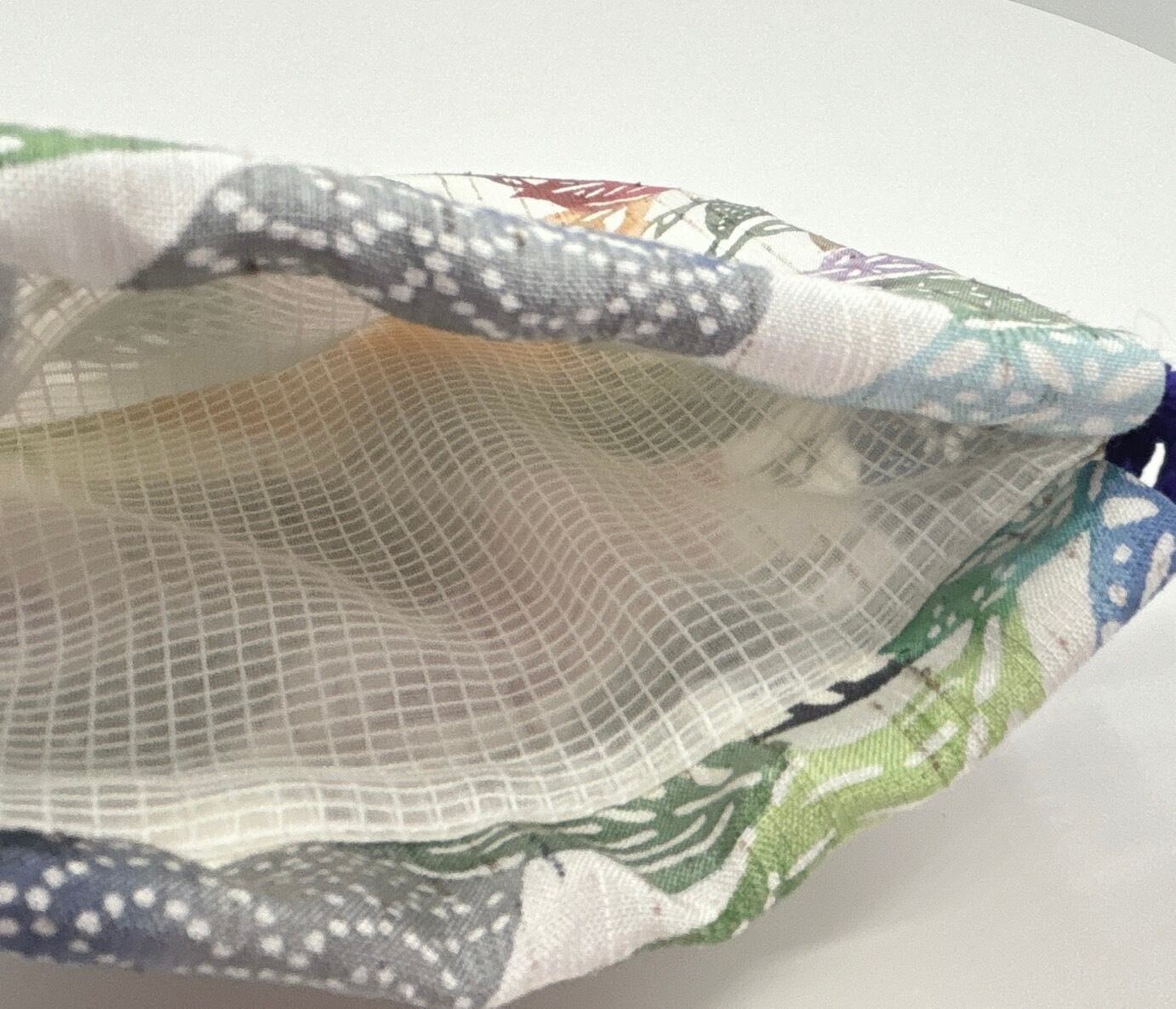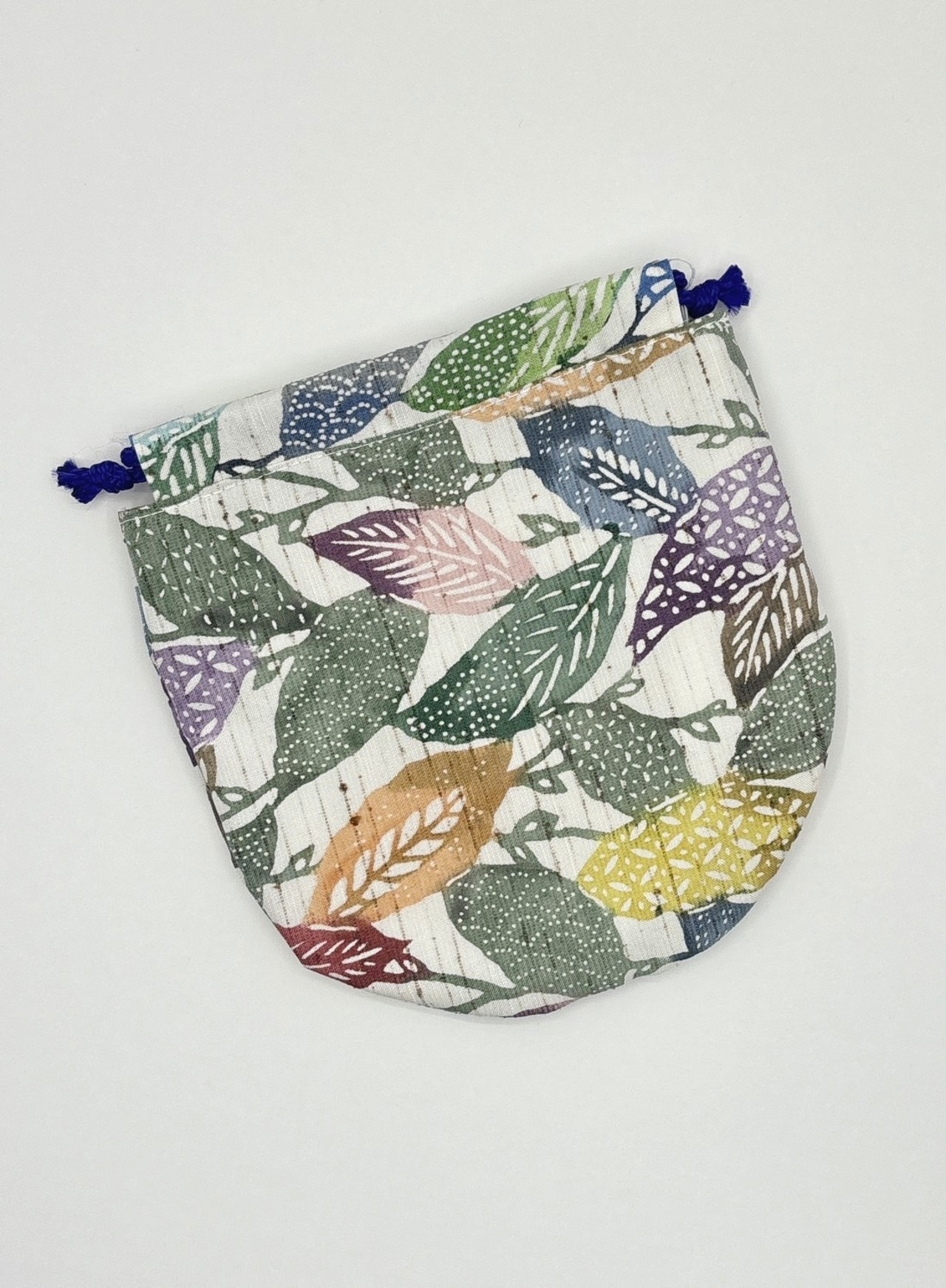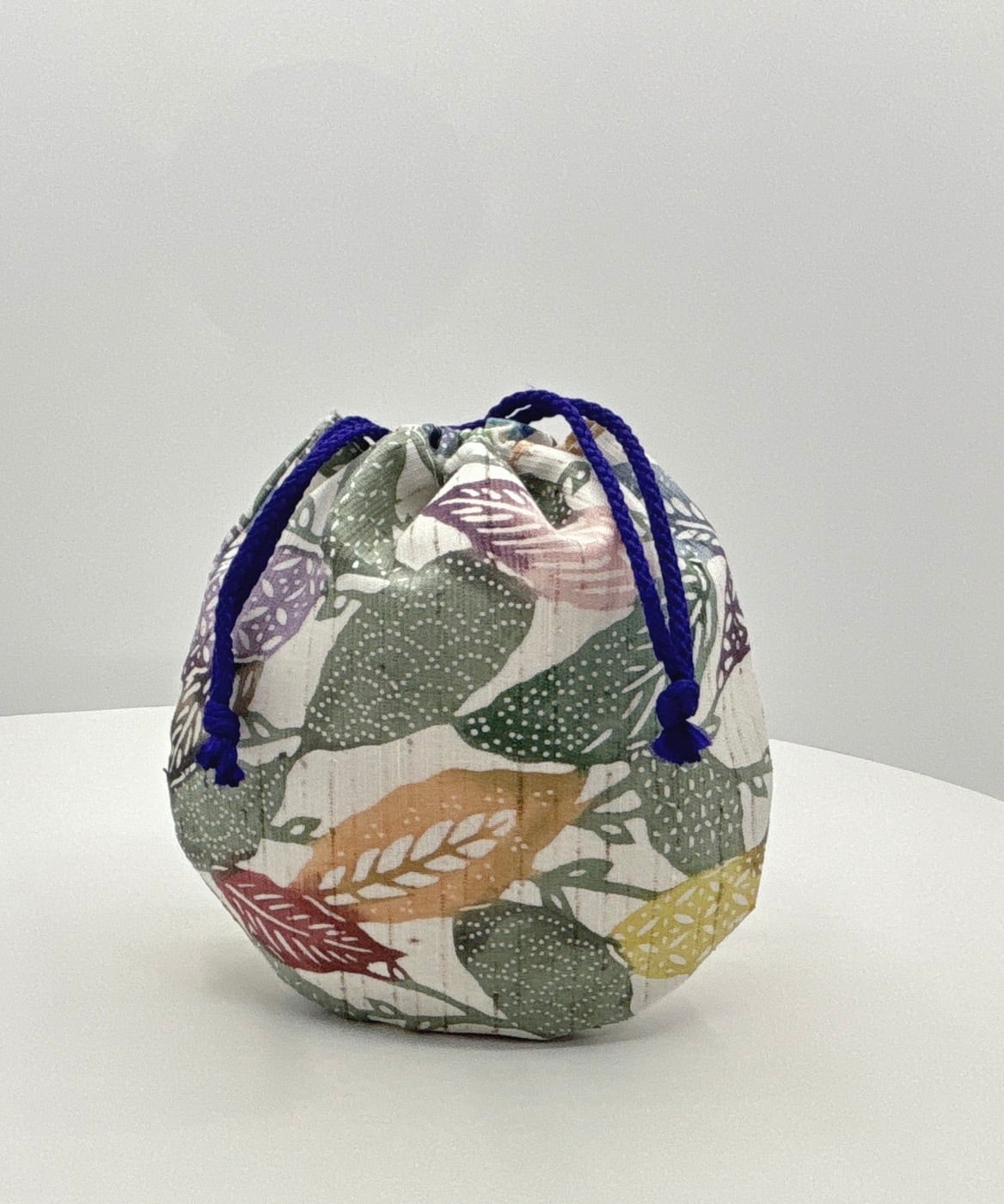 表地には高級感漂うぜんまい紬を使用し、裏地には絹紅梅を贅沢に取り入れたこの巾着は、葉柄の華やかさが際立ちます。手のひらサイズで、鞄の中で迷子になりやすい小物を収納するのにぴったりのアイテムです。