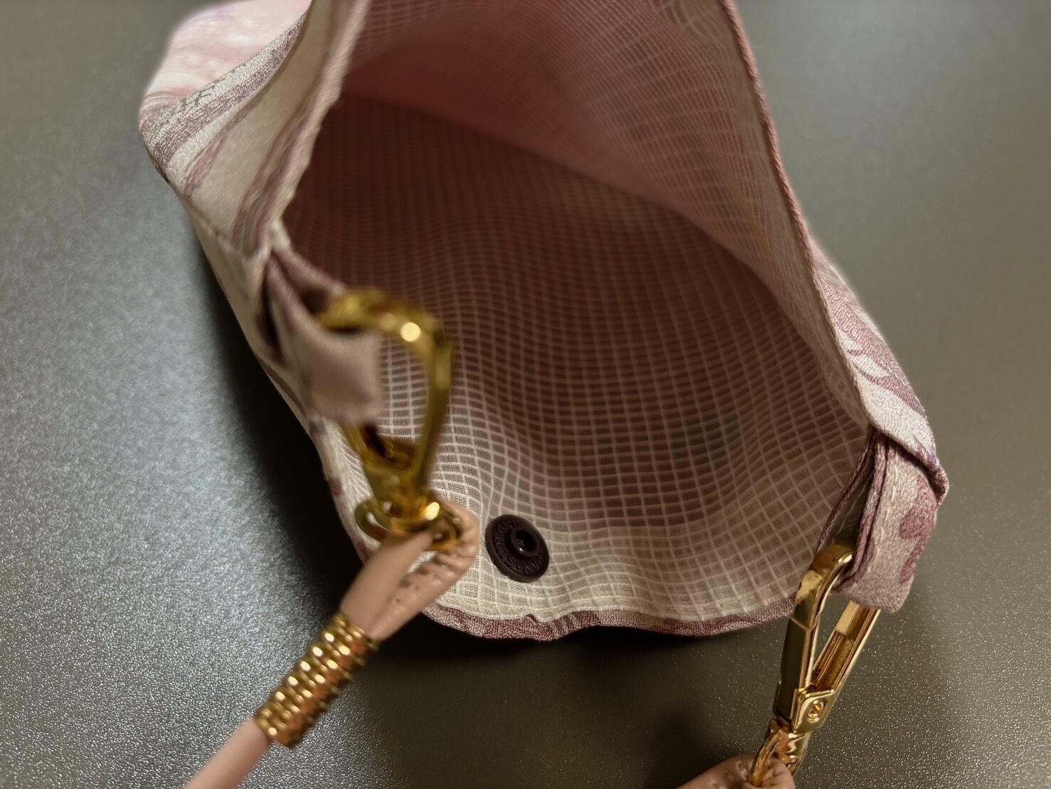 ピンク系のくすみ色に染められたこのポシェットは、色挿しが施され、携帯電話がすっぽりと収まるサイズ感が魅力的。日常生活の中で、スタイリッシュかつ機能的に持ち運ぶことができるアイテムです。
