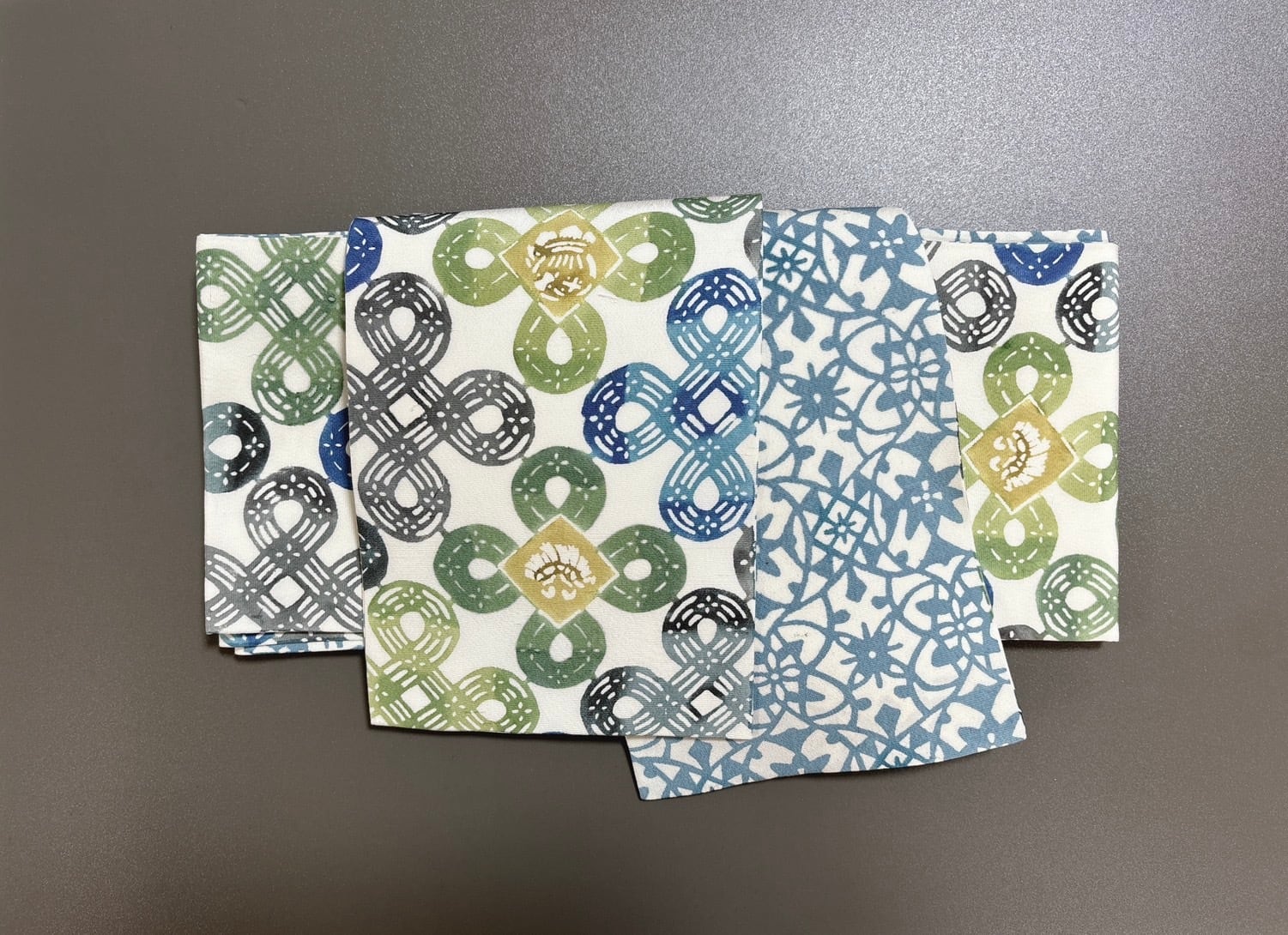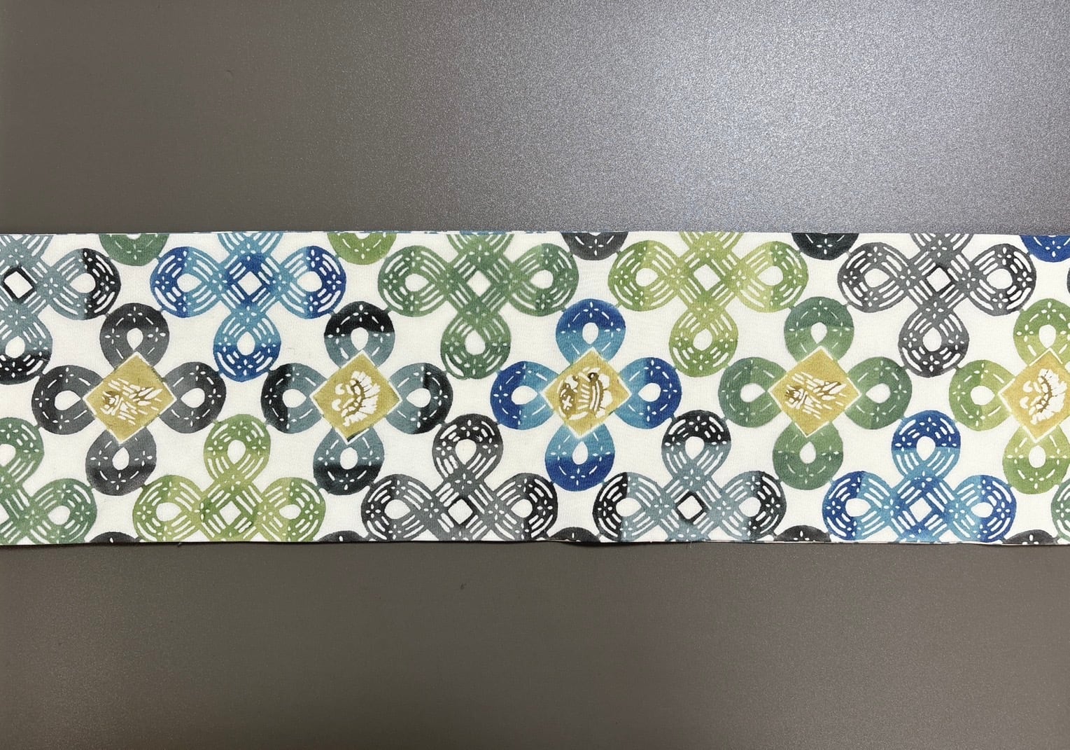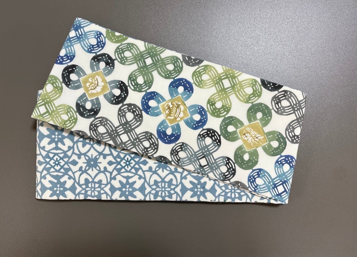 この半幅帯は、両面で異なる2柄の魅力を存分に楽しむことができます。緑系の新鮮でエネルギッシュな配色と、深淡いブルーグリーンが見事に調和し、あなたのコーディネートに華やかさをプラスします。手作業ならではの温かみを感じられる贅沢なアイテムです。