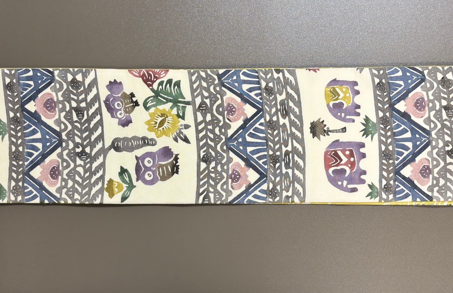 この半幅帯は、両面に異なる美しい柄を楽しむことができる贅沢なアイテムです。一面は色とりどりのフクロウとゾウの柄が元気に描かれており、華やかな印象を与えます。そしてもう一面は、穏やかな窃黄色で染め上げられた葉の柄が上品さを醸し出します。このコントラストが、あなたのコーディネートに新たな魅力をプラスしてくれることでしょう。