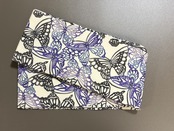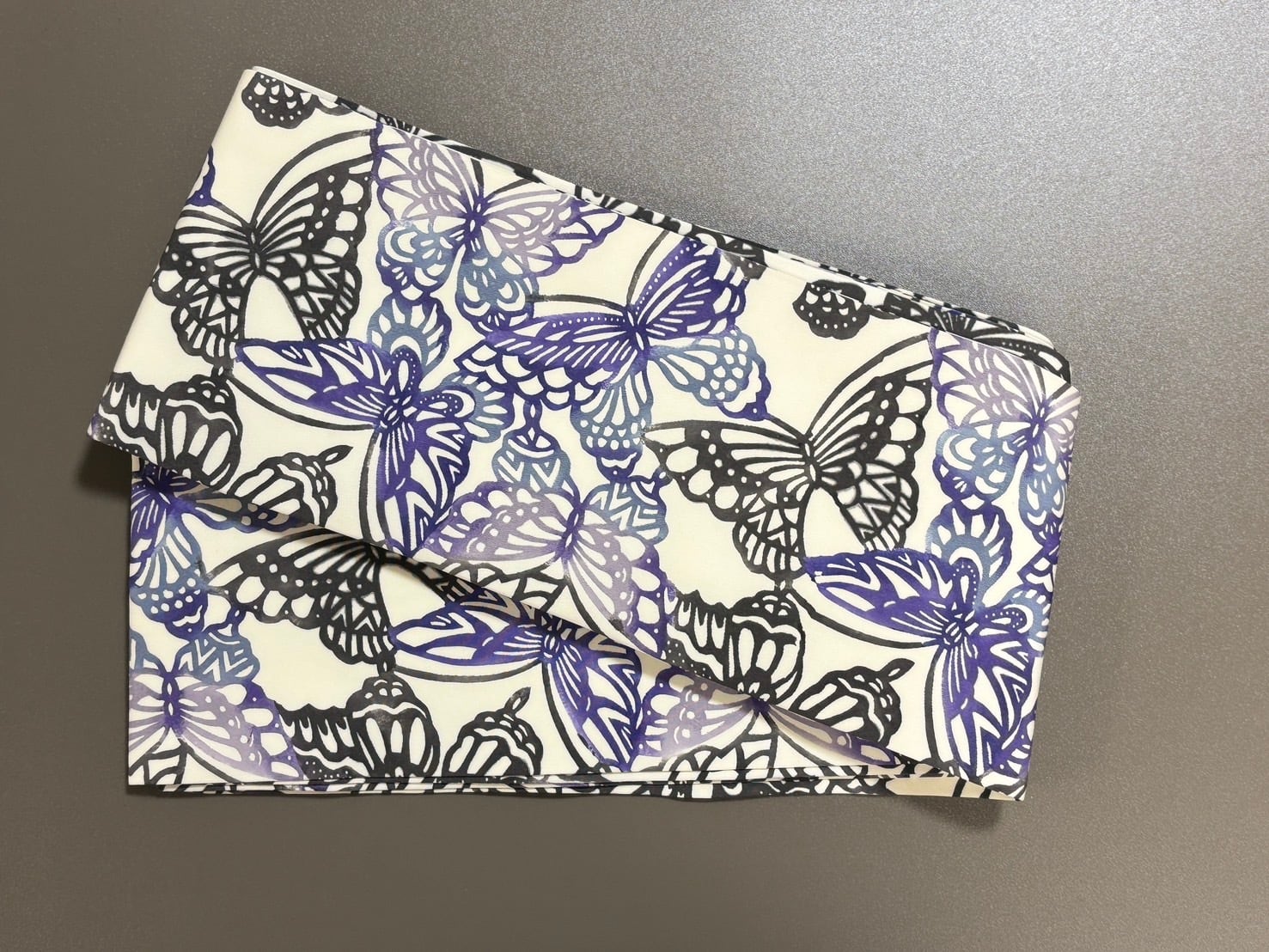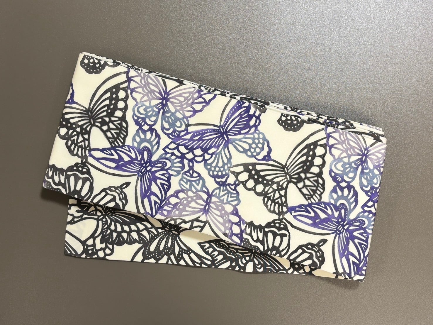 この半幅帯は、両面に異なる魅力的な配色を楽しむことができる贅沢なアイテムです。一面はシックな黒一色で染められた蝶々の柄が存在感を放ち、もう一面は紫系の配色で華やかに彩られたデザインとなっています。このコントラストが、あなたのコーディネートに新しい魅力を加えてくれることでしょう。