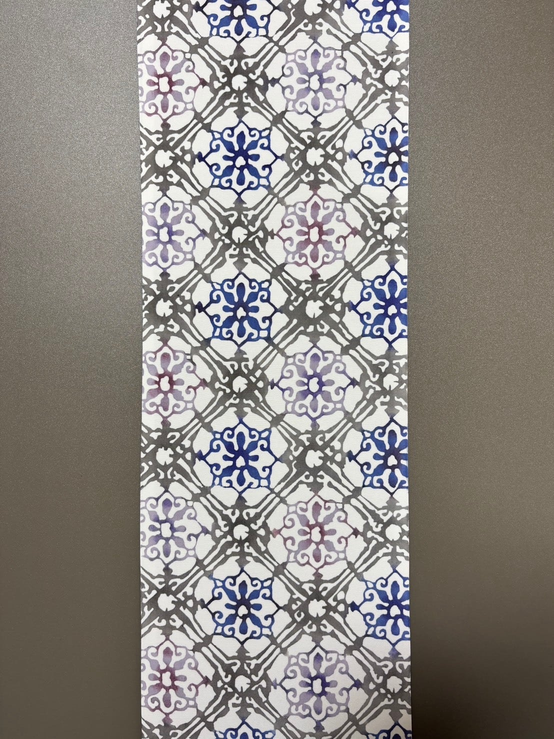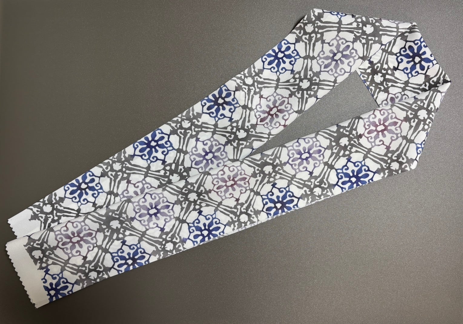 この半衿は、柔らかく縫い付けやすい絹交織の生地を使用しており、藍・薄紫を主に使用したやさしい配色が特徴です。