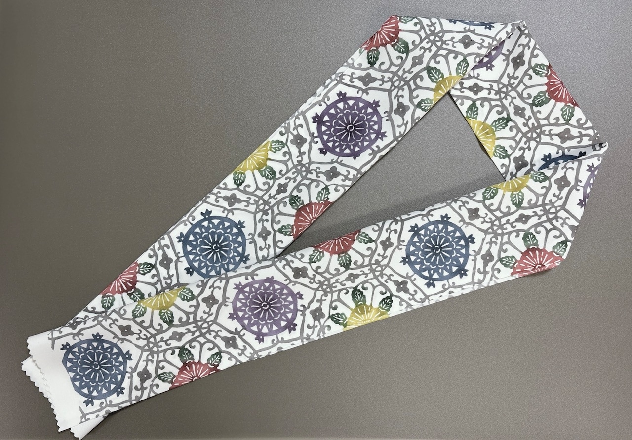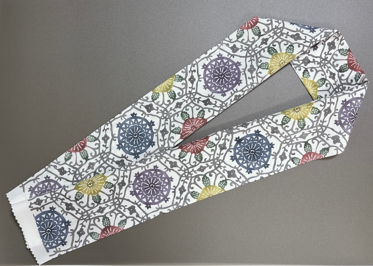 この半衿は、柔らかく縫い付けやすい絹交織の生地を使用しており、黄・赤・紫をポイント差しをしたさっぱりとした柄が特徴です。