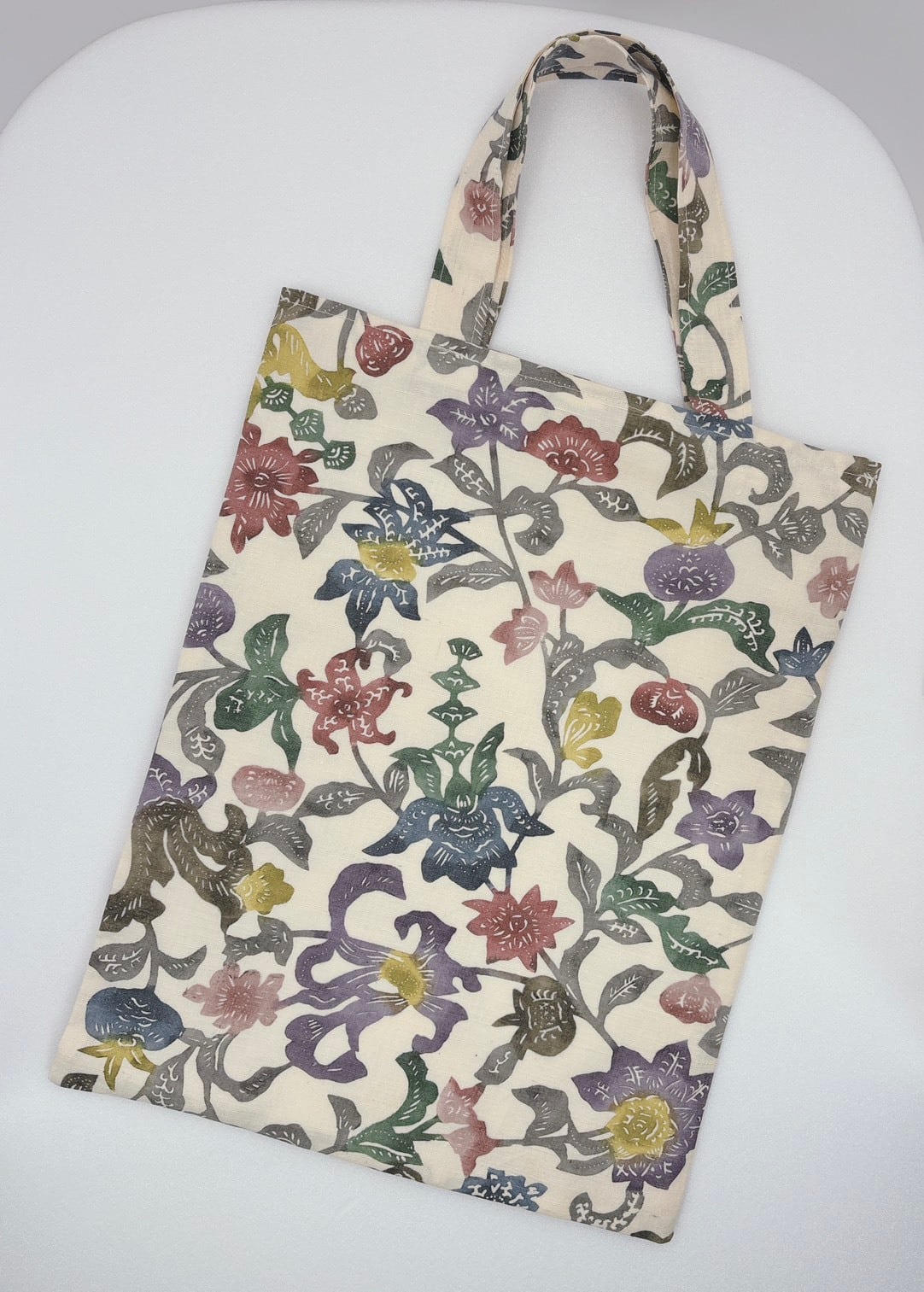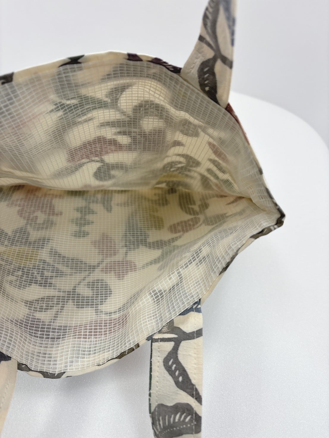 このバッグは、軽量で丈夫な結城紬を表生地に使用し、裏地には優雅な絹紅梅が採用されています。更紗調の柄が色豊かに使用されており、見る人を惹きつける華やかなデザインです。多彩なコーディネートにぴったりなアイテムとなることでしょう。