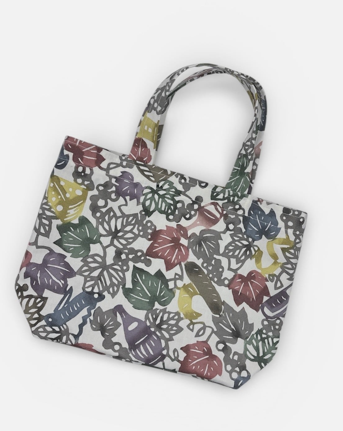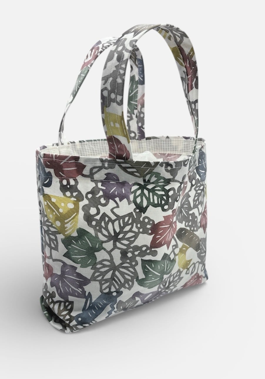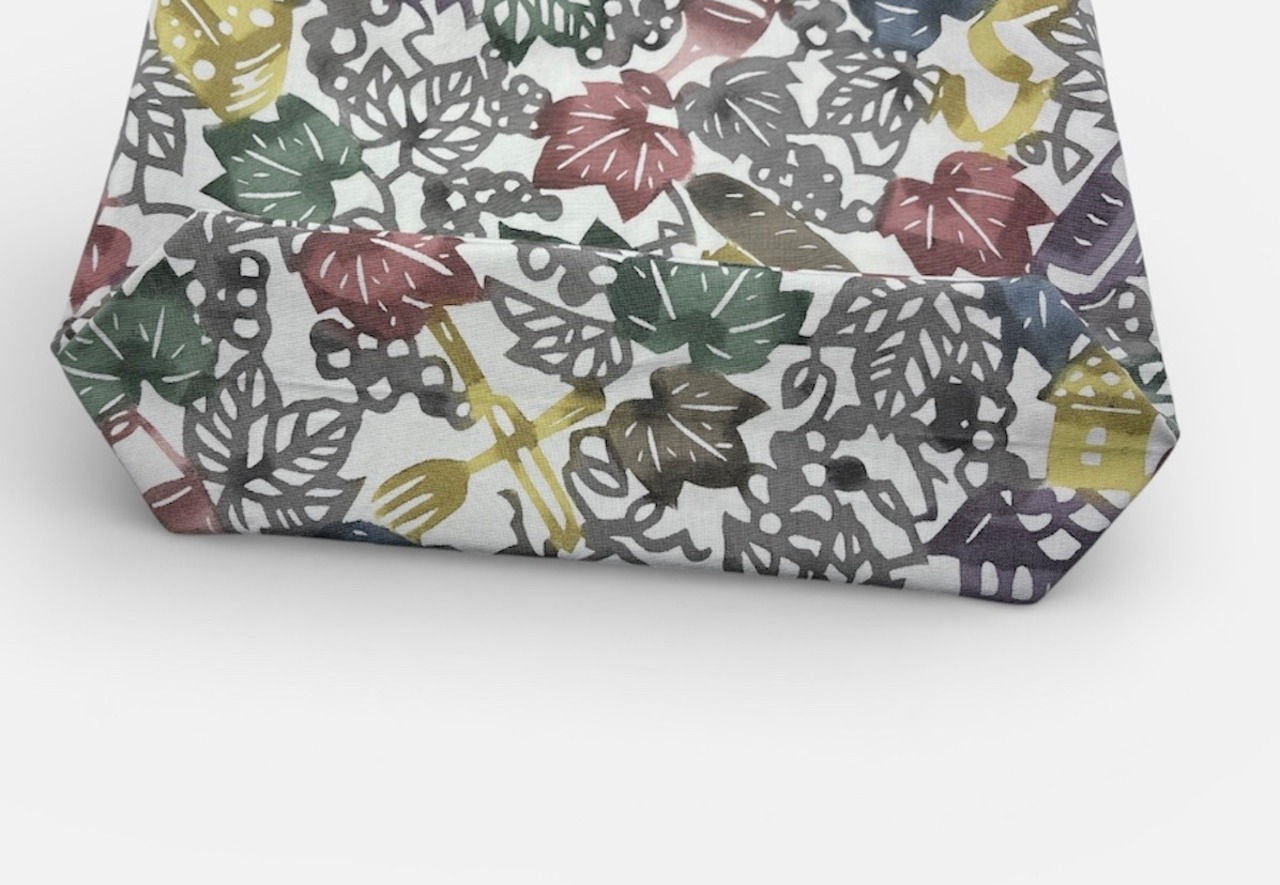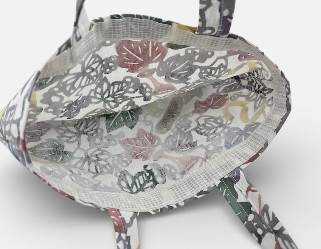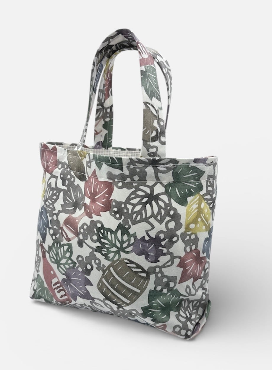 手挿しの江戸紅型染めによる葡萄とワインの柄が華やかさを引き立て、色豊かなデザインが目を楽しませてくれます。しっかりとしたマチがあり、軽やかな綿素材だから、普段使いやお出かけにぴったりのアイテムです。