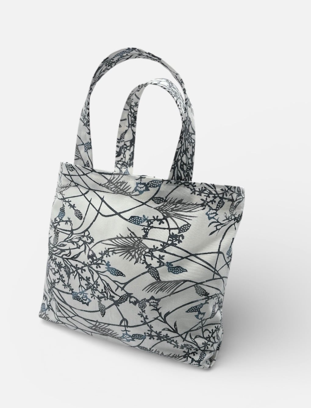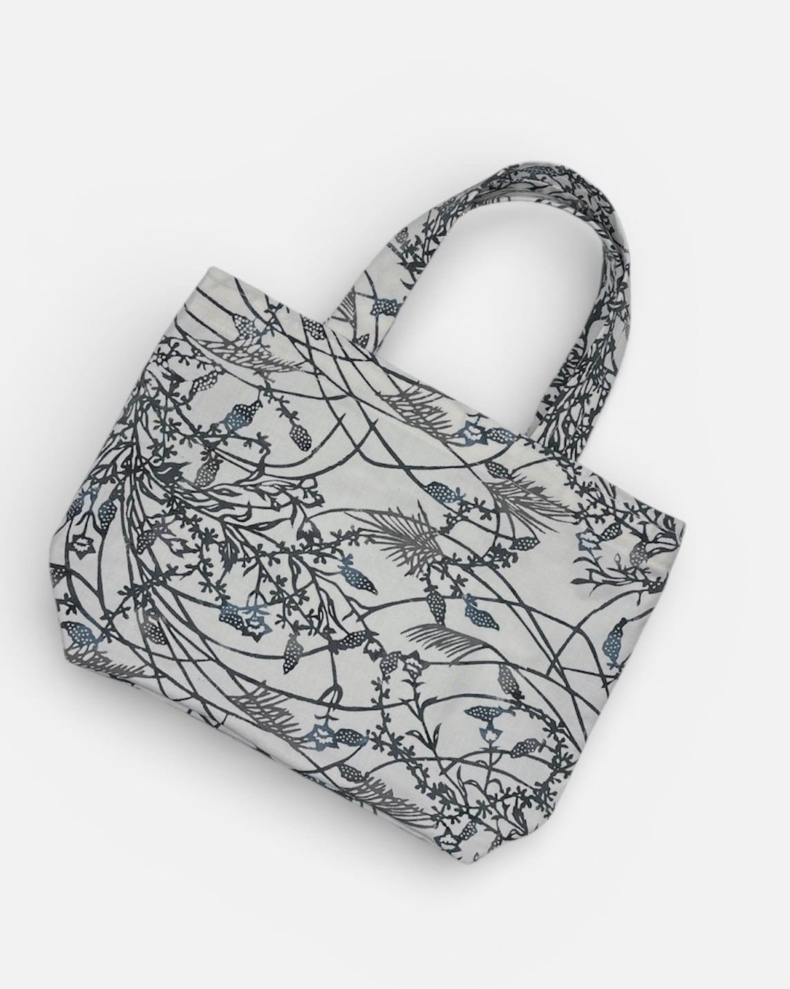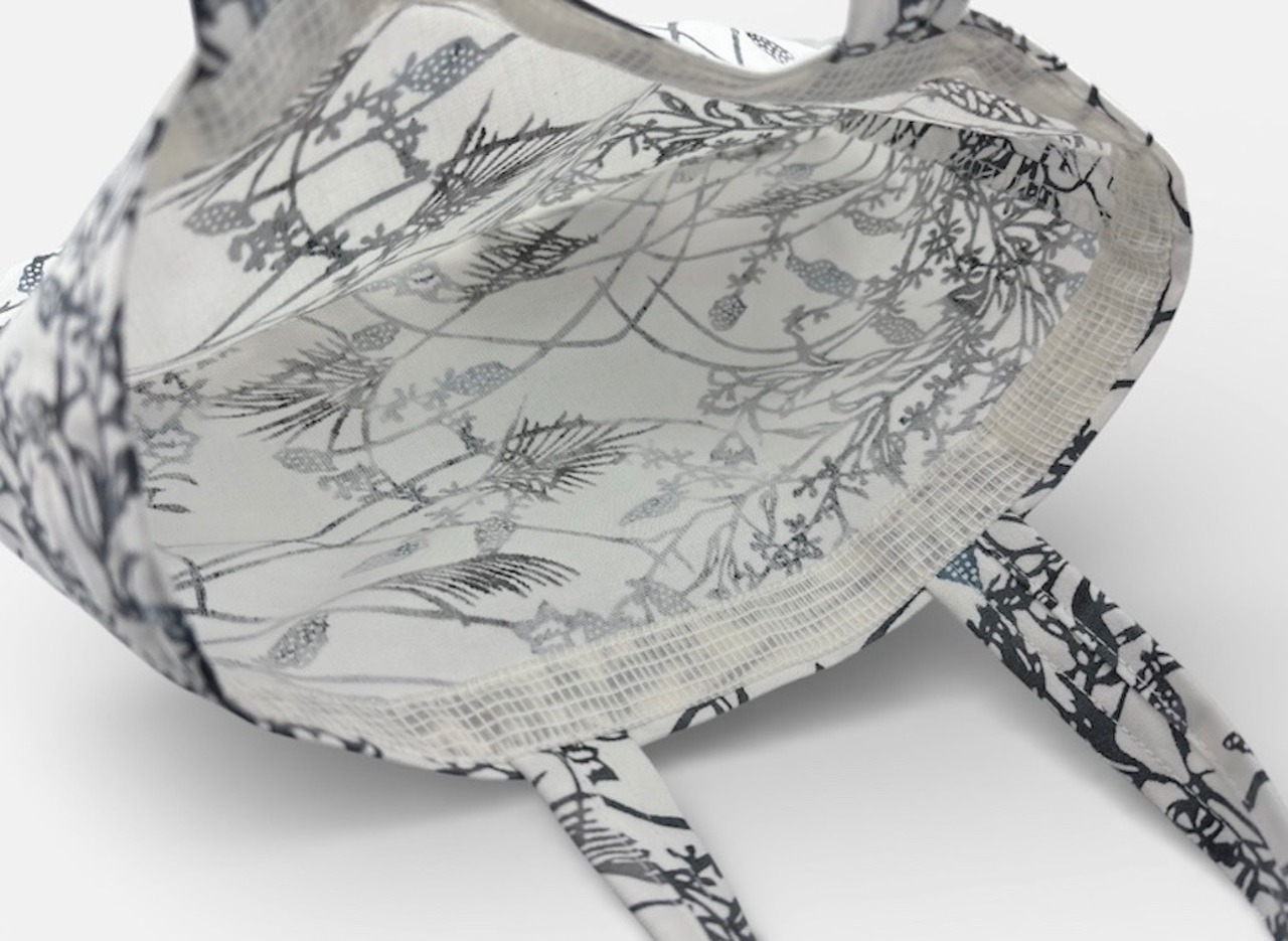 手挿しの江戸紅型染めによる小花と実の柄が、藍系の配色で見事に調和し、サッパリとした美しさを演出しています。しっかりとしたマチがあり、小ぶりながらも十分な収納力を誇るため、日常のお出かけやちょっとしたお買い物に最適です。軽やかな綿素材で、持ち運びも快適に行えます。
