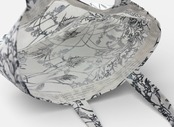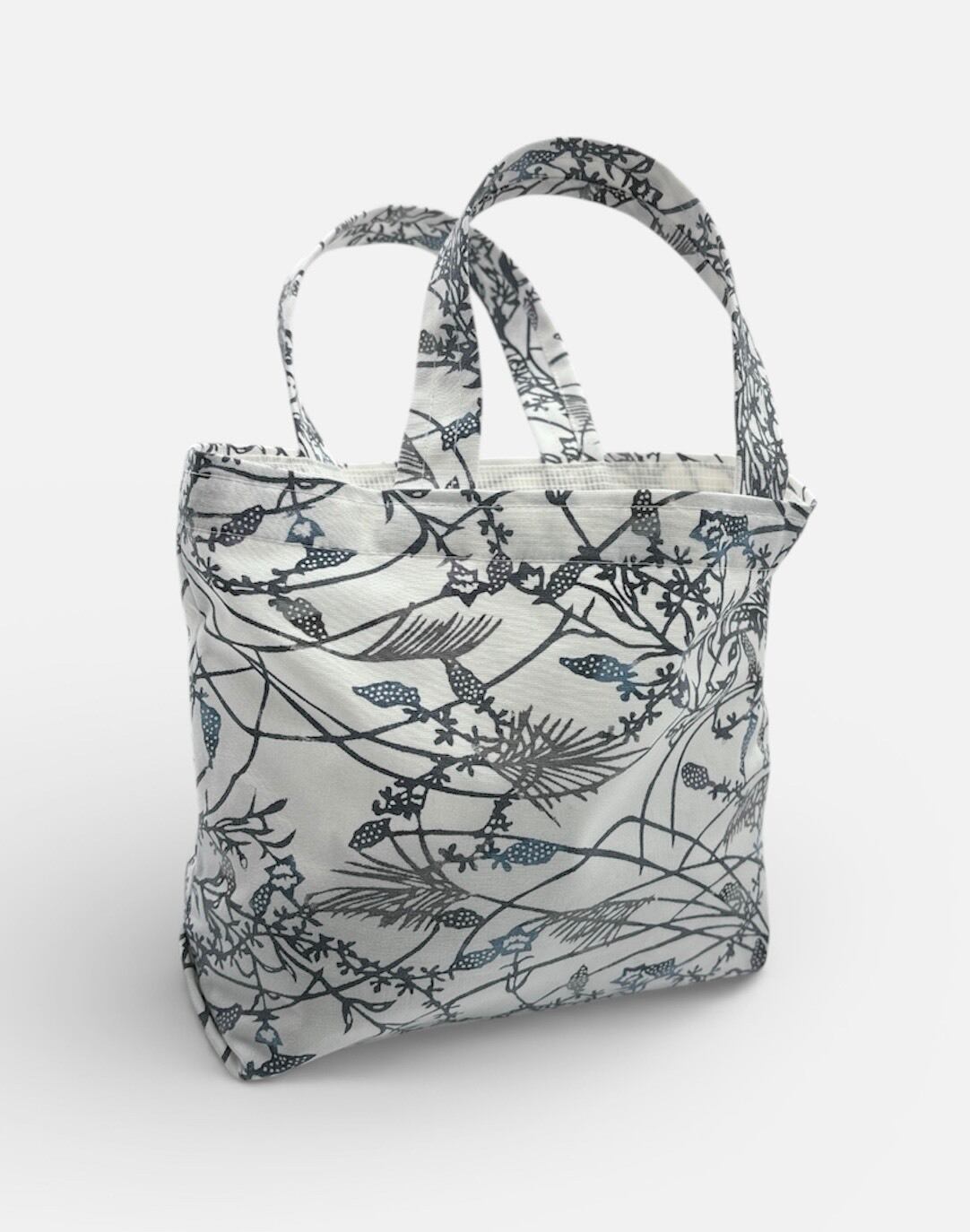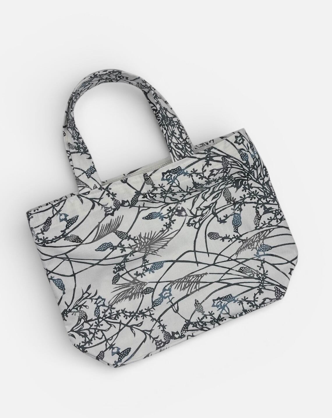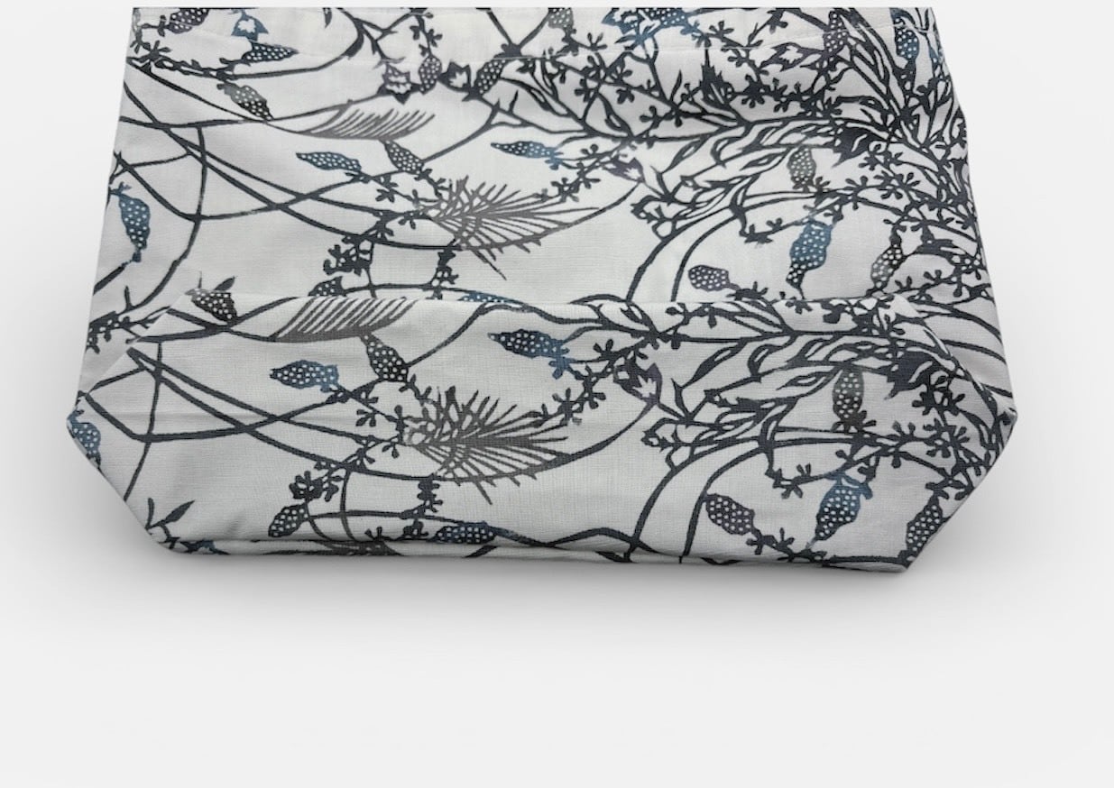 手挿しの江戸紅型染めによる小花と実の柄が、藍系の配色で見事に調和し、サッパリとした美しさを演出しています。しっかりとしたマチがあり、小ぶりながらも十分な収納力を誇るため、日常のお出かけやちょっとしたお買い物に最適です。軽やかな綿素材で、持ち運びも快適に行えます。