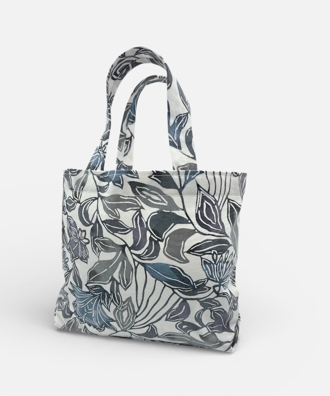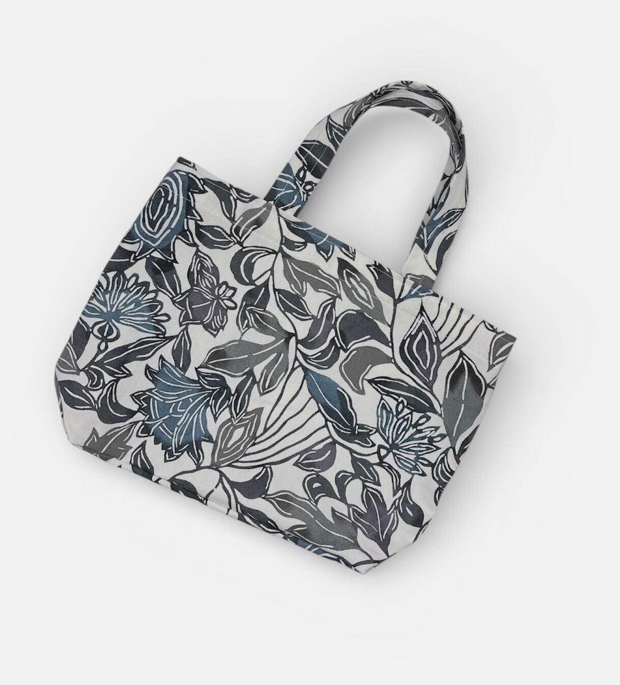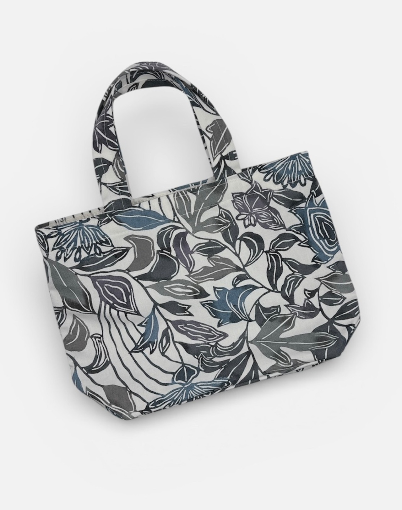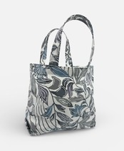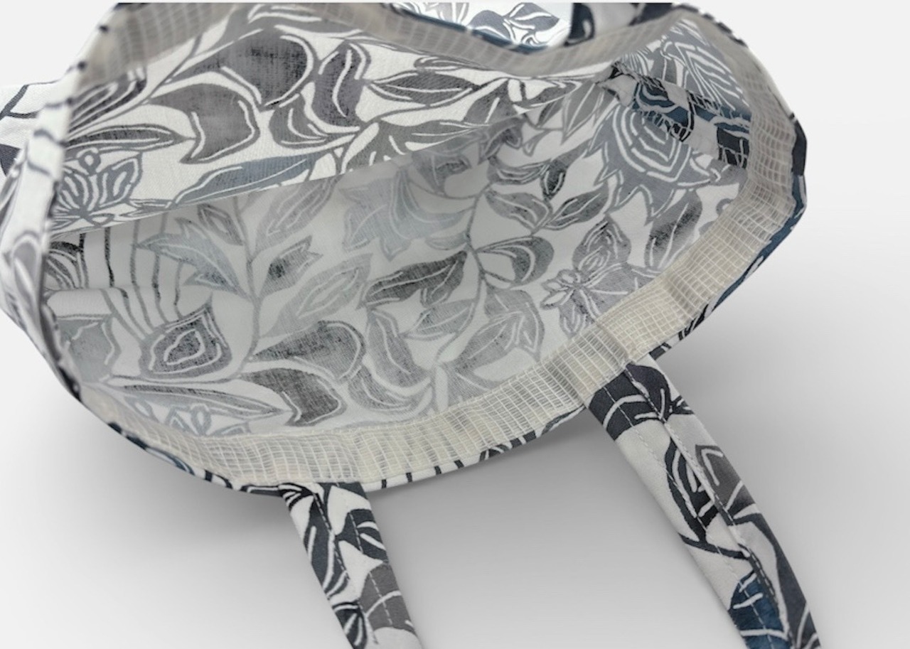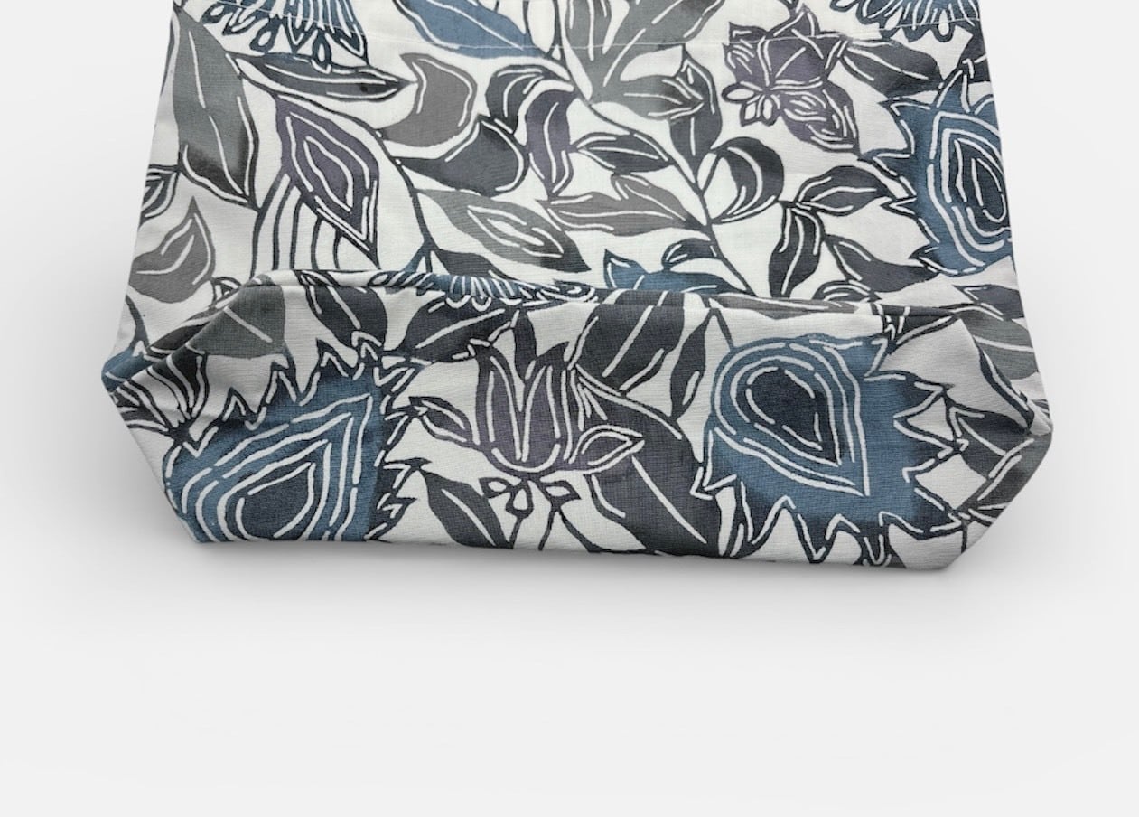 手挿しの江戸紅型染めによる更紗調の柄が、藍系の配色で美しい一体感を醸し出しています。しっかりとしたマチがあり、小ぶりで持ちやすいデザインが特徴ですので、日常のお出かけやちょっとしたお買い物にもぴったりです。軽やかな綿素材を使用しており、持ち運びも快適に楽しめます。