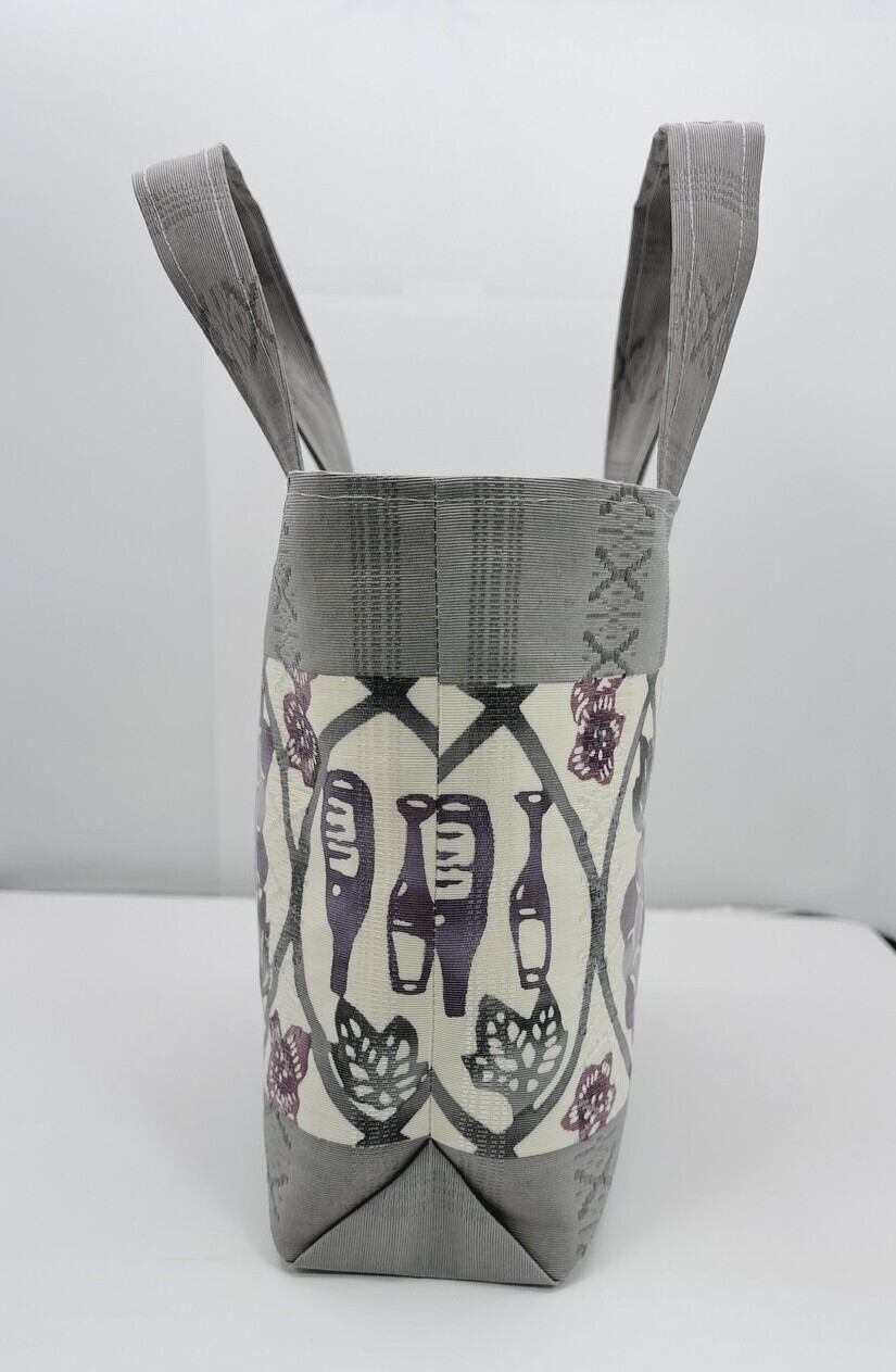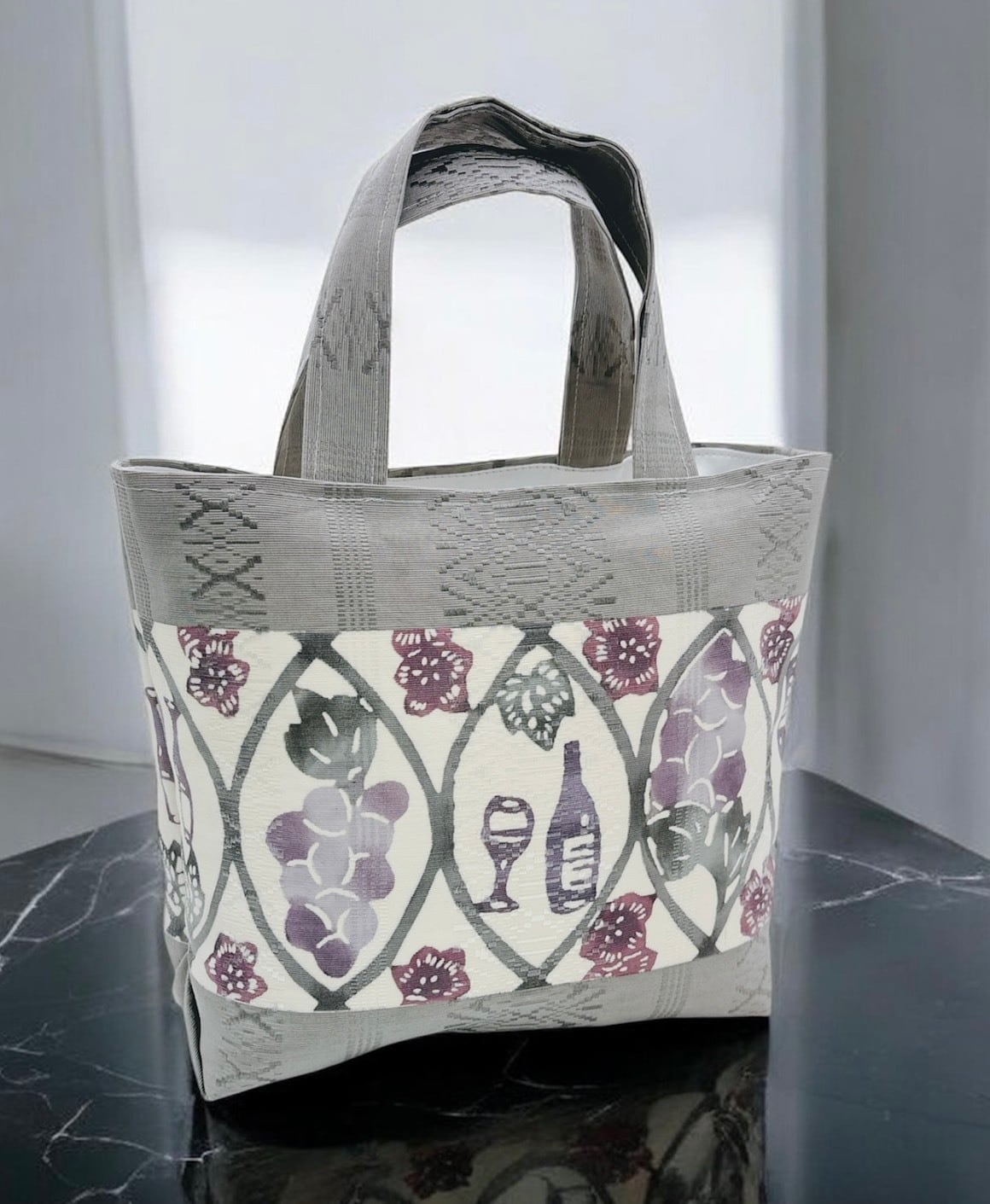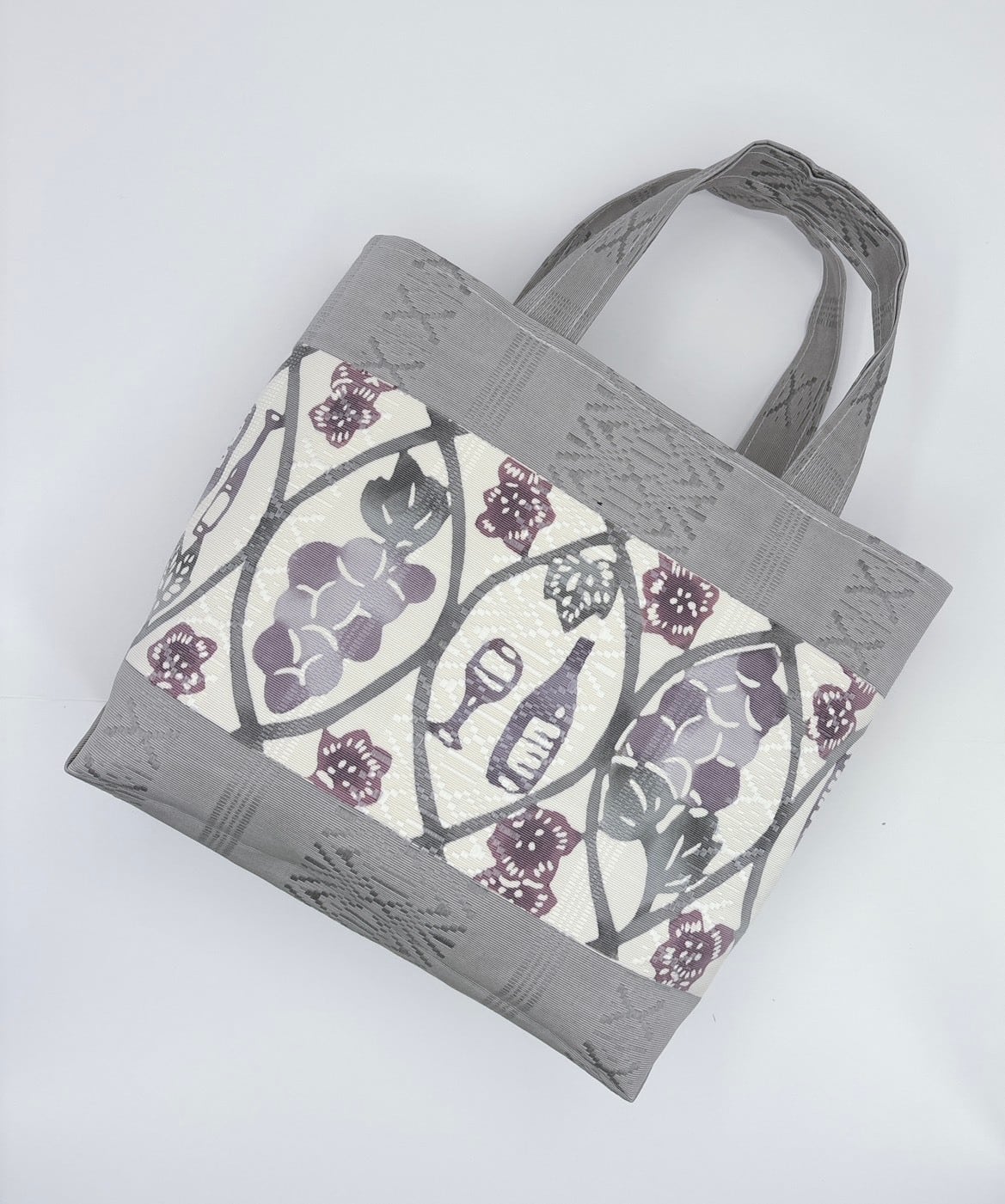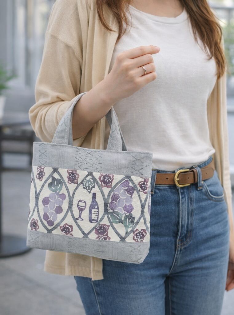 美しい葡萄ワイン柄が映える新作の手提げバッグが登場しました!手挿しの江戸紅型染めで仕上げられたこのバッグは、博多献上帯地を使用し、しっかりとした生地感が自立する魅力を持っています。小ぶりでかわいいサイズ感は、日常使いにも特別なシーンにもぴったりです。
