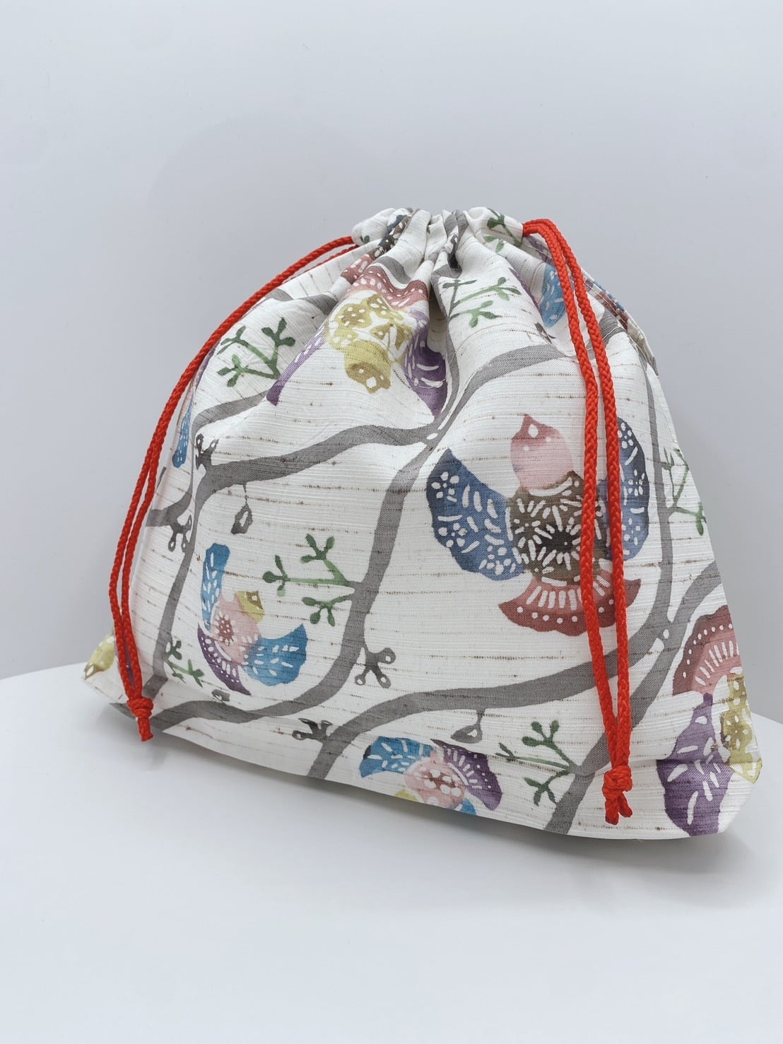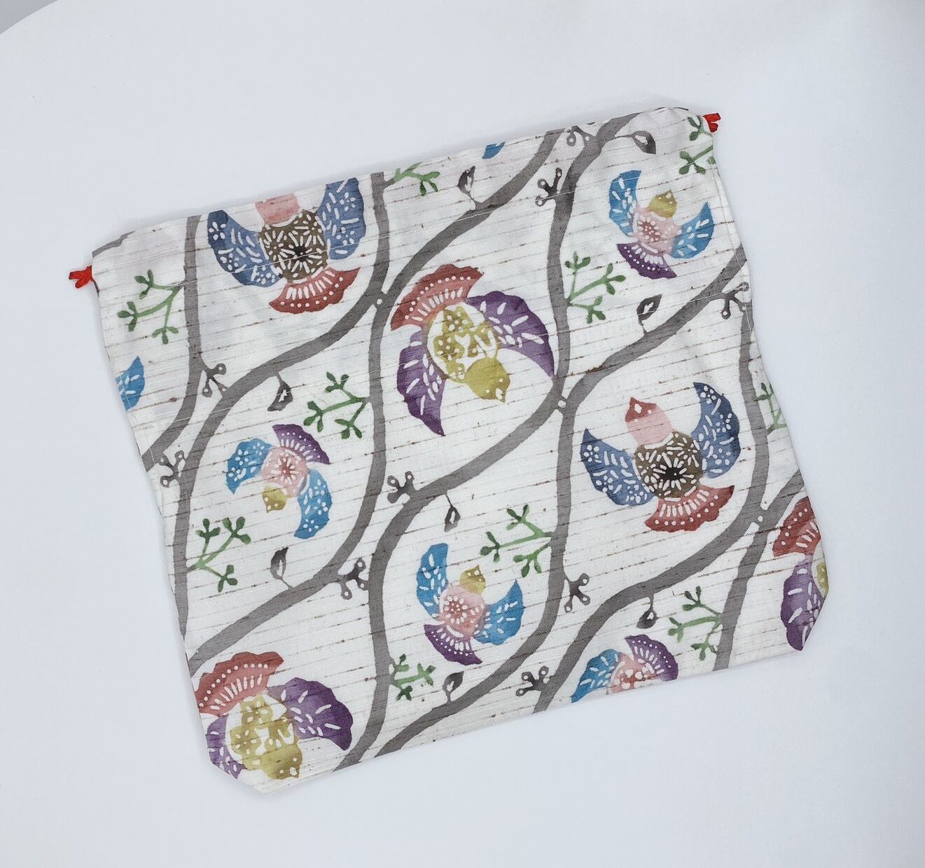 手挿し江戸紅型染め巾着、その名は福良雀柄。ふんわり広がる巾着口が、荷物をしっかり包み込みます。