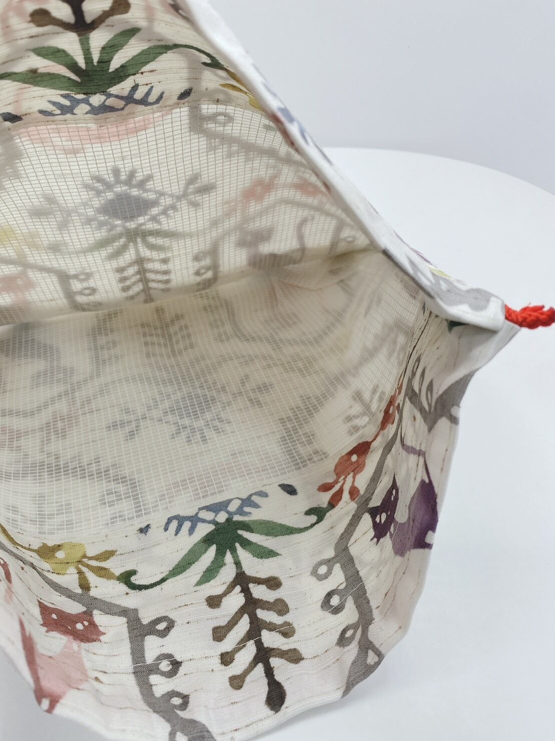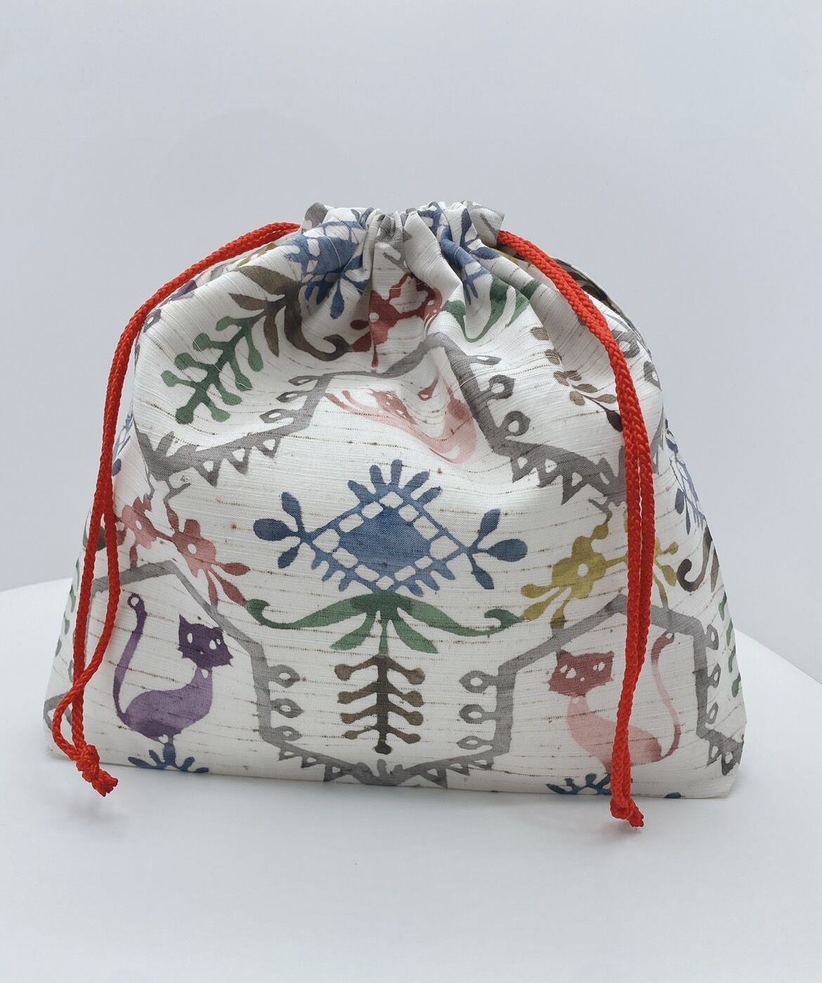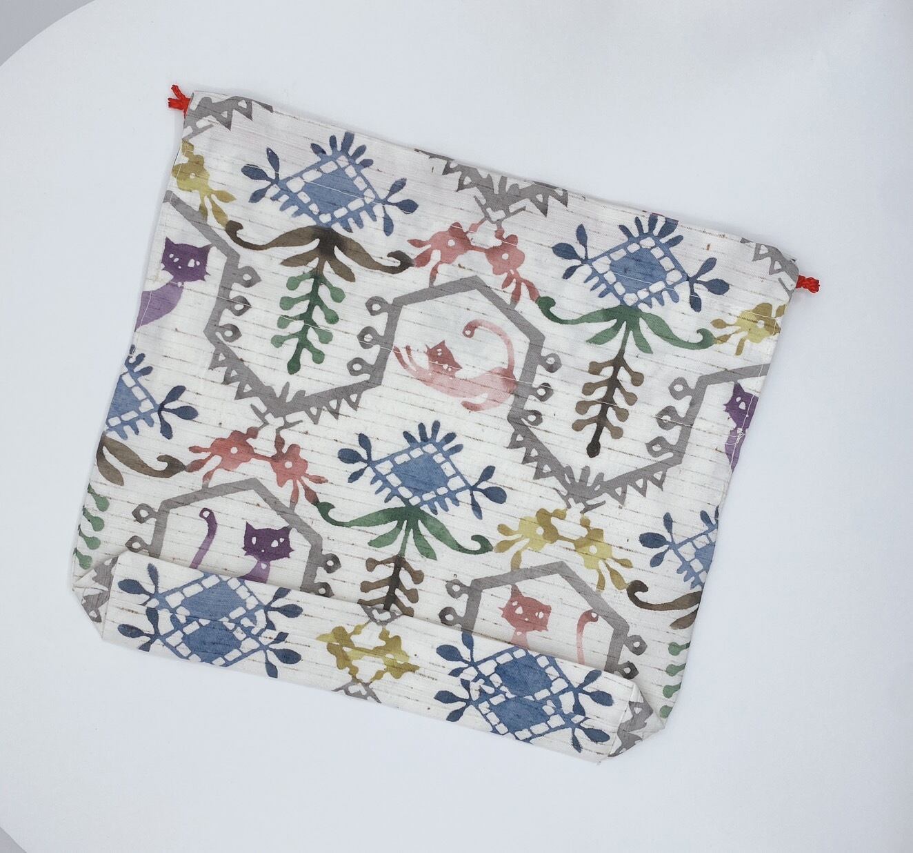 手挿し江戸紅型染めで丁寧に作られた、ひだがないネコ柄の巾着。色とりどりのネコ柄が可愛らしさを演出し、持ち運びに便利なサイズ感で、小物やアクセサリーを整理整頓するのに最適です。表地にはぜんまい紬を使用し、裏地には絹紅梅を使っているので、手触りも良く高級感もあります。