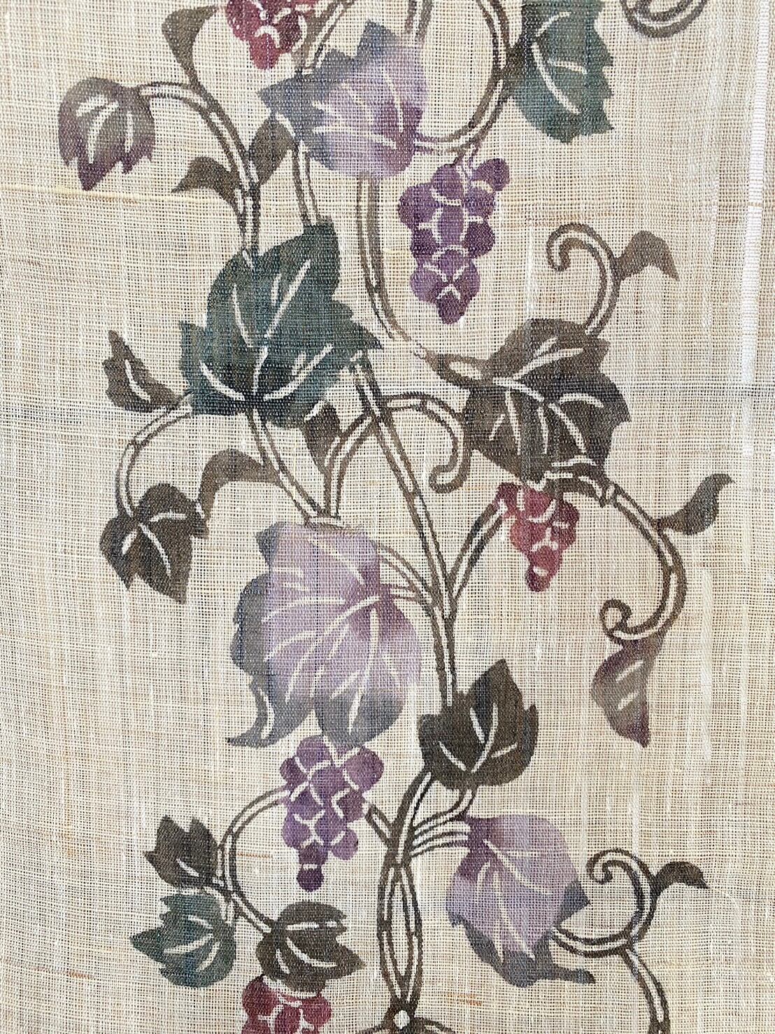 手挿し江戸紅型染めで仕上げた、上品なぶどう柄の暖簾が登場しました。高級感漂う配色で、お部屋の雰囲気を一層引き立てます。麻素材は天然繊維で通気性が良く、湿気を吸収してくれるので清潔さも保てます。