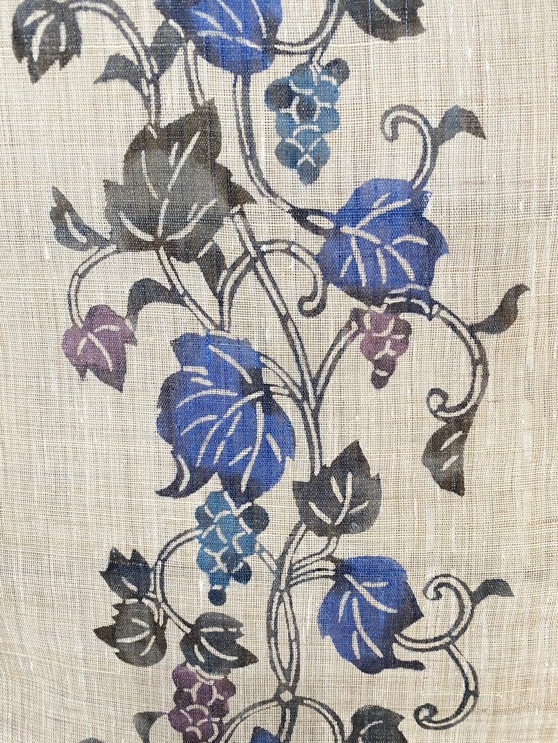 伝統的な手挿し江戸紅型染めで仕上げられた、100%麻素材の暖簾。爽やかな藍系配色に、涼しげなぶどう柄が施されています。日本の夏を涼やかに演出してくれる一枚です。窓辺や玄関先に掛ければ、風通し良くて涼しい空間作りが叶います。