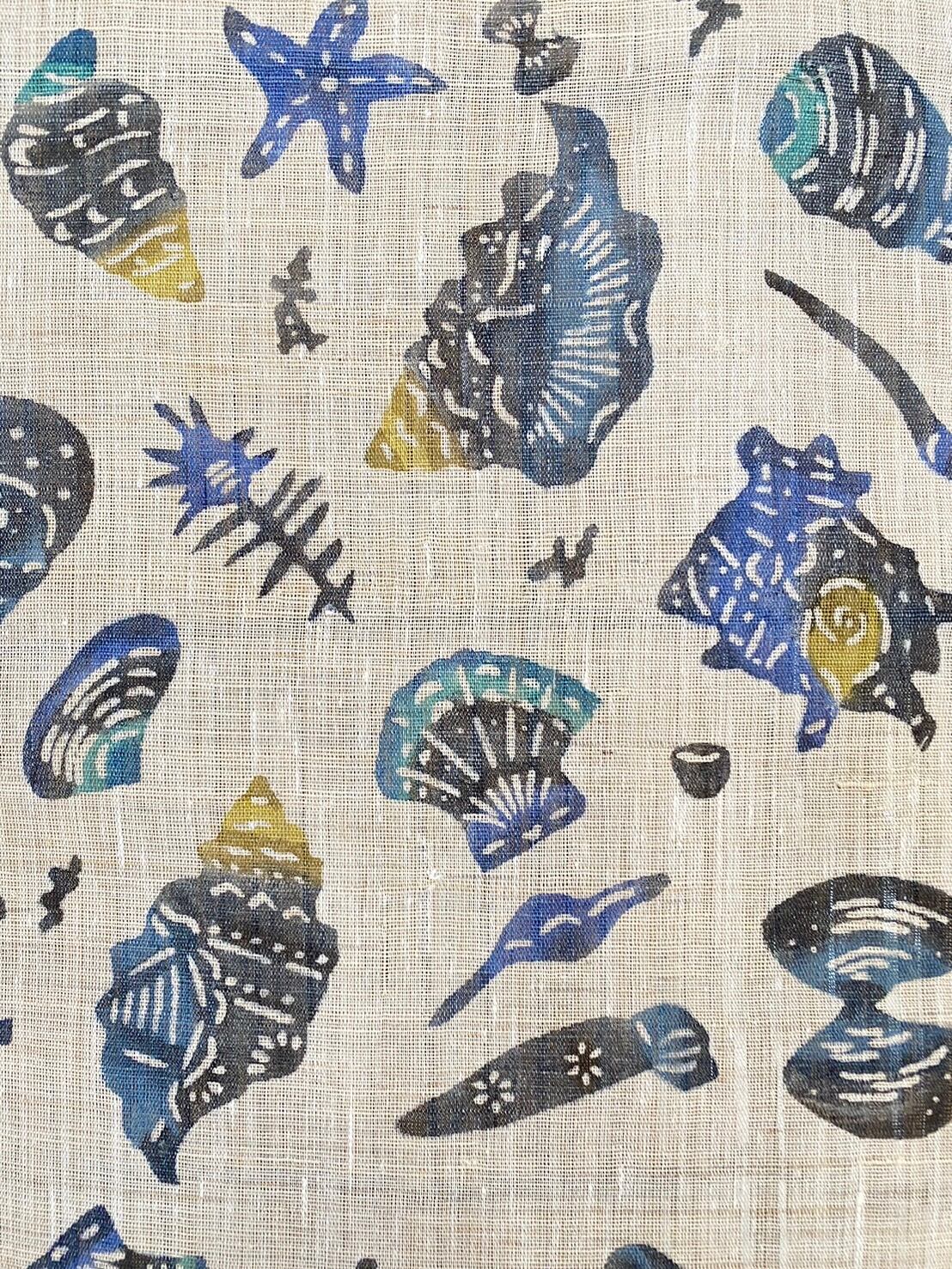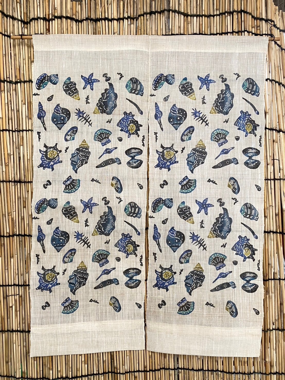 手挿しで染められた、風情漂う暖簾、「暖簾 100㎝」。麻素材で作られたこの暖簾は、貝の柄が美しく描かれ、和の風情を演出してくれます。さらっとした麻生地が軽やかな印象を与え、お部屋に清涼感を与えてくれること間違いありません。