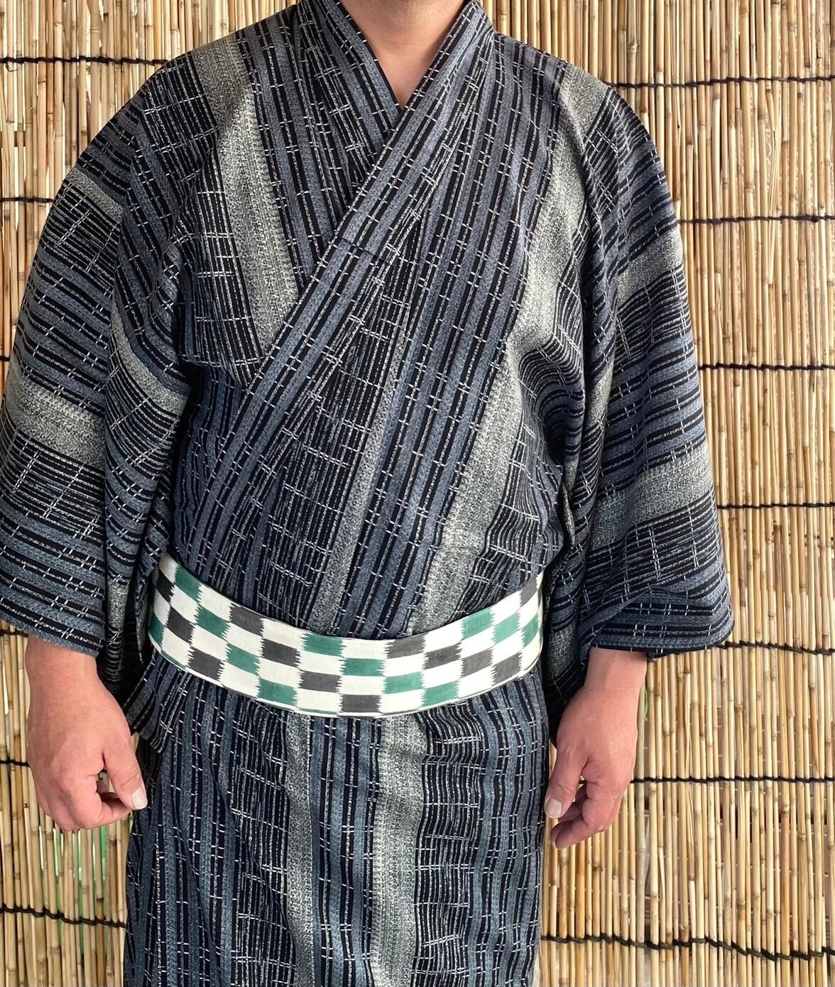 手挿し江戸紅型染めが施されたシックな緑と黒の色合いが美しい、角帯の仕立て上がり品です。変わり市松柄が洗練された印象を与え、どんな着物とも相性抜群。お祝い事やパーティーなどのフォーマルな場面から、カジュアルな日常使いまで幅広く活躍してくれること間違いなし。