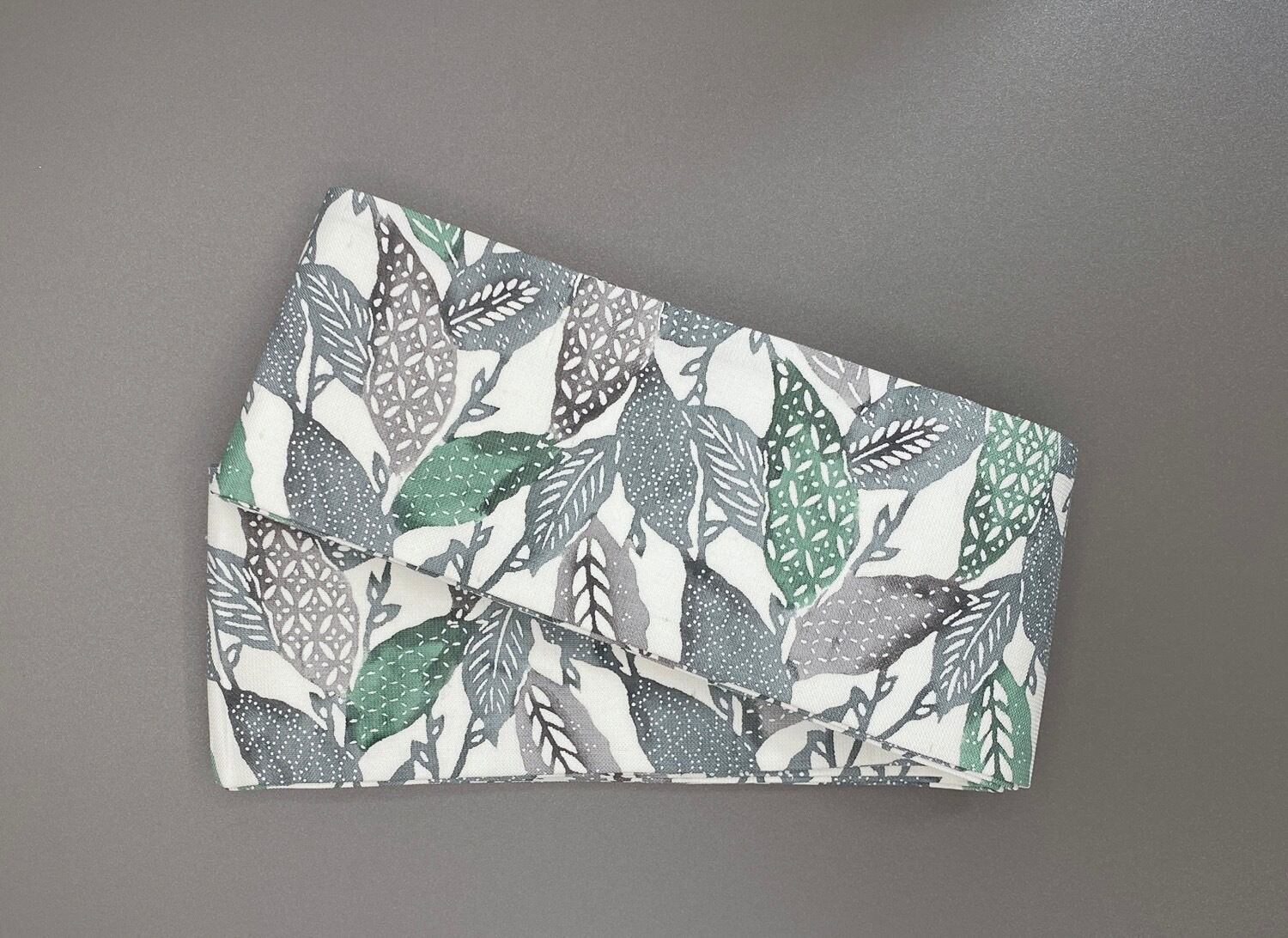 手挿し江戸紅型染め角帯 葉の柄 くすみのあるグリーンを使用した、幅10㎝の角帯です。贅沢な風合いと色使いが、着物姿をさらに華やかに演出してくれます。
