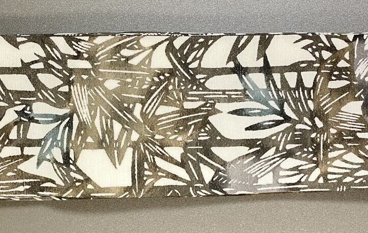 手挿し江戸紅型染めで仕立て上げた、洗練されたデザインの角帯が登場しました。幅10㎝の巾で、笹の柄が美しく施されたカーキと茶を主に使用した高級感漂う一本。