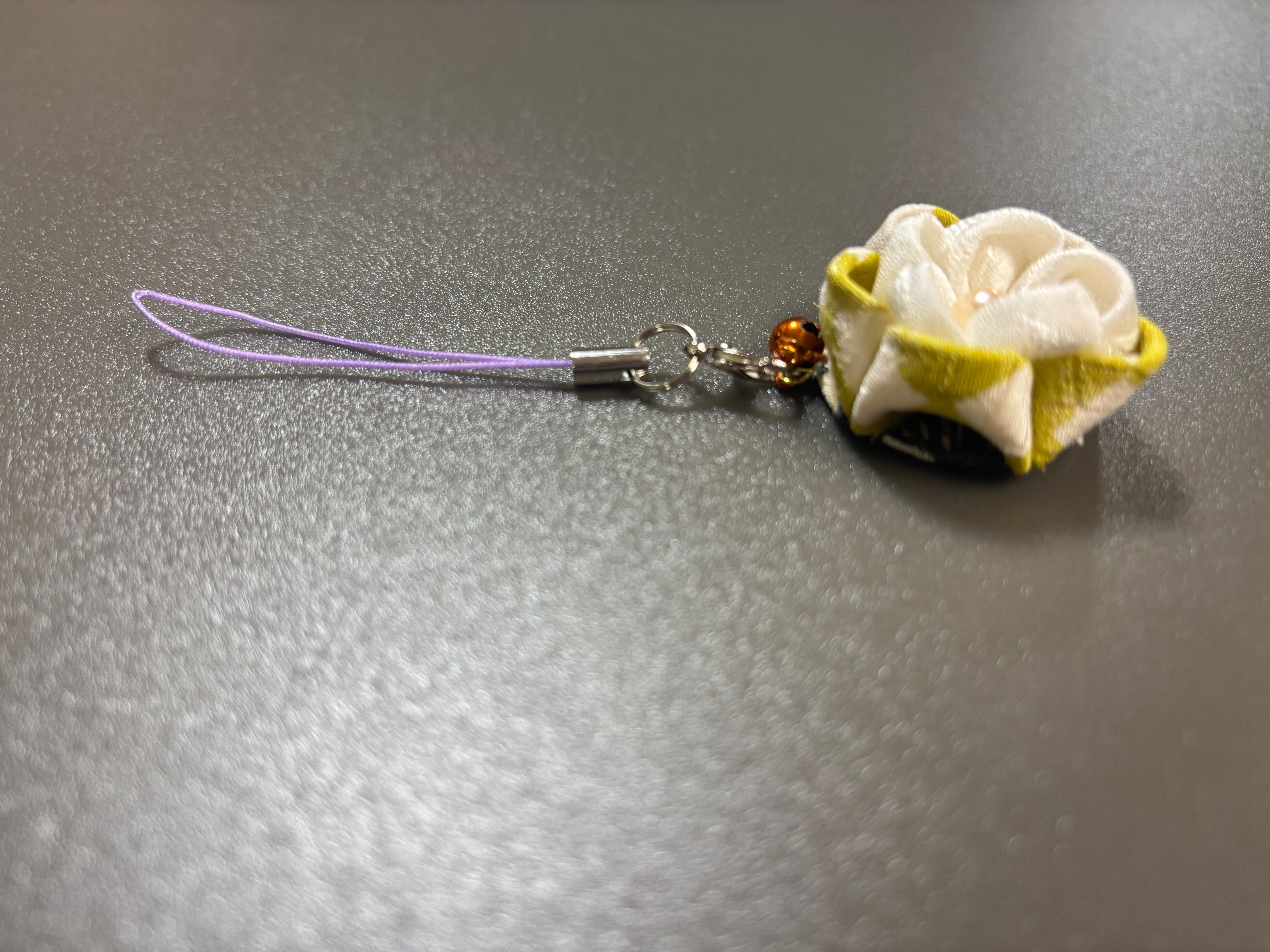 手挿し江戸紅型染めを施した、優雅な花形のつまみ細工の根付です。白地のちりめん生地とからし色の紬を使用し、洗練された色合いが華やかさを演出します。この根付は、日常的なコーディネートに個性を添えたり、特別な場面であなたの存在感を引き立てます。
