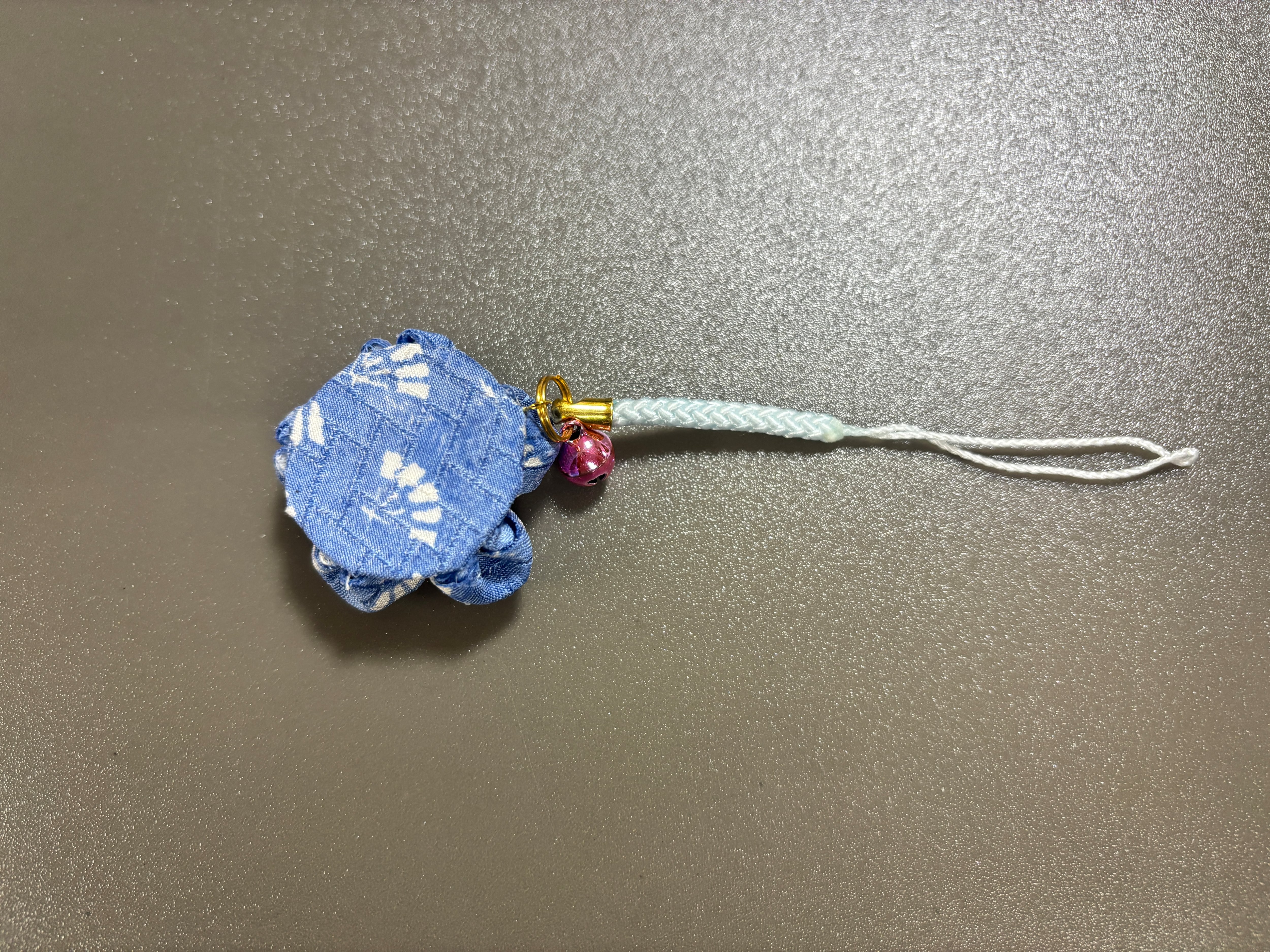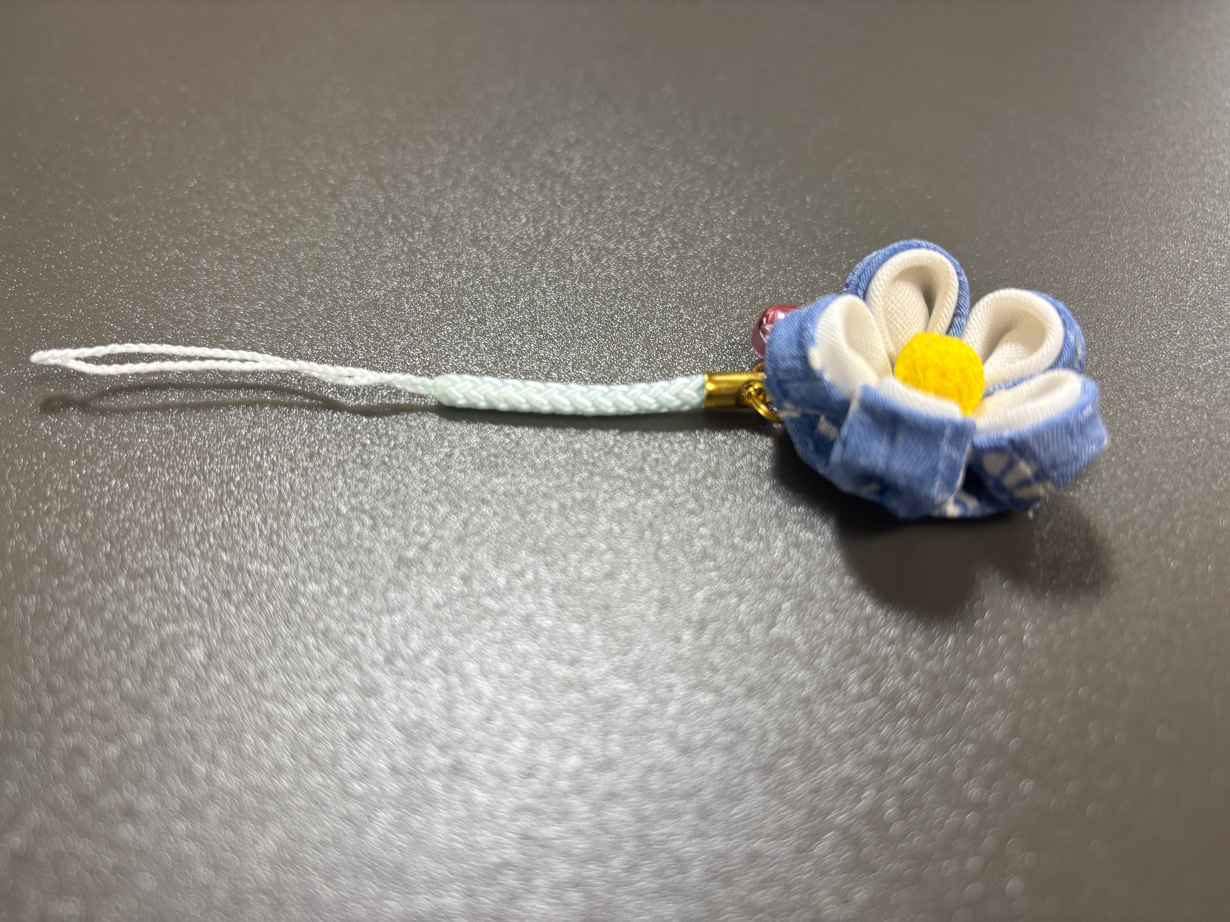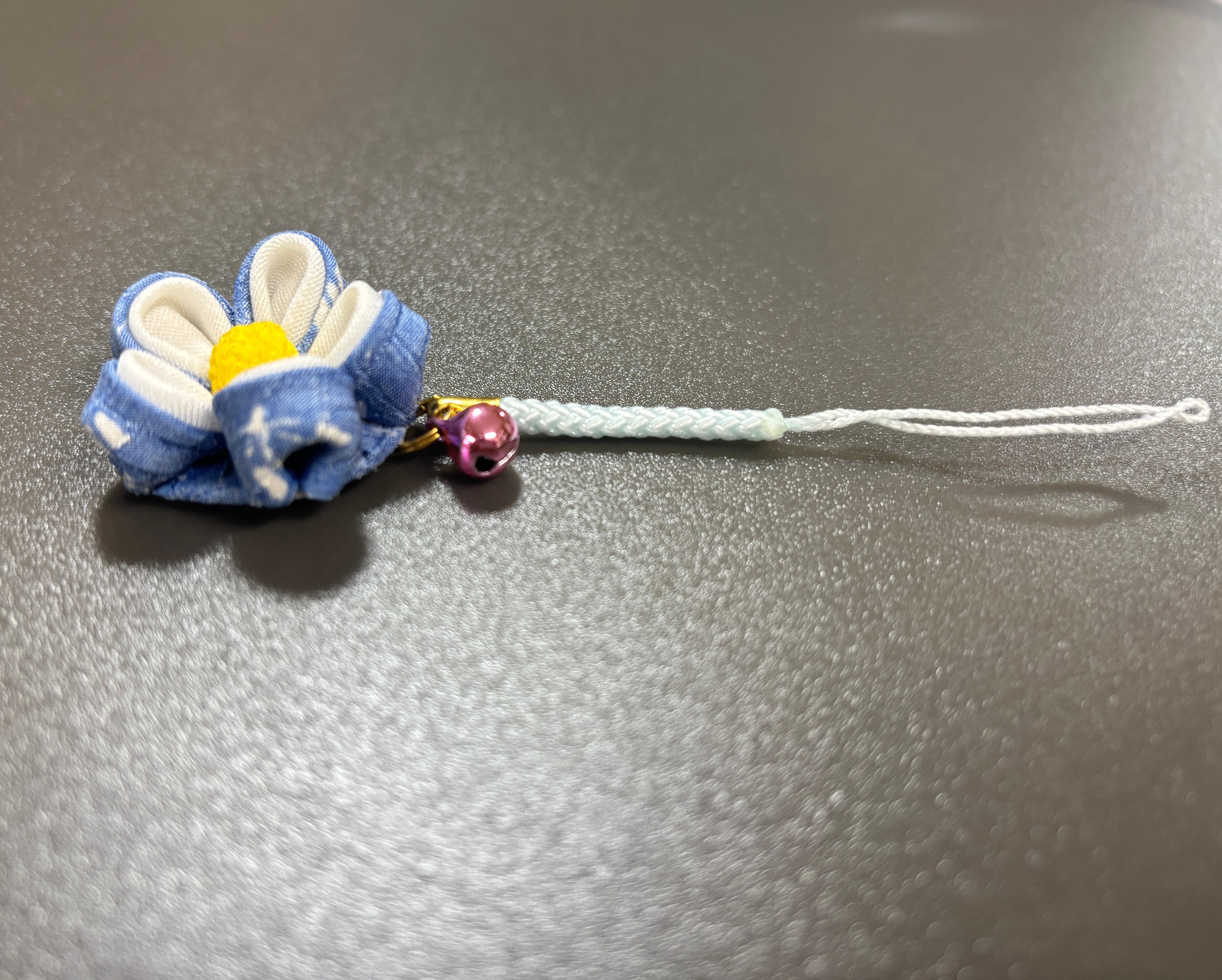 手挿し江戸紅型染めによる華やかな花形デザインが特徴のつまみ細工の根付です。ちりめんの白生地と淡い藍色の紬を使用し、落ち着いた色合いが優雅さを演出します。この根付は、日常のコーディネートに個性を添えたり、特別なシーンでもあなたを引き立てる魅力的なアイテムです。根付パーツを付けると帯にも挟めます。