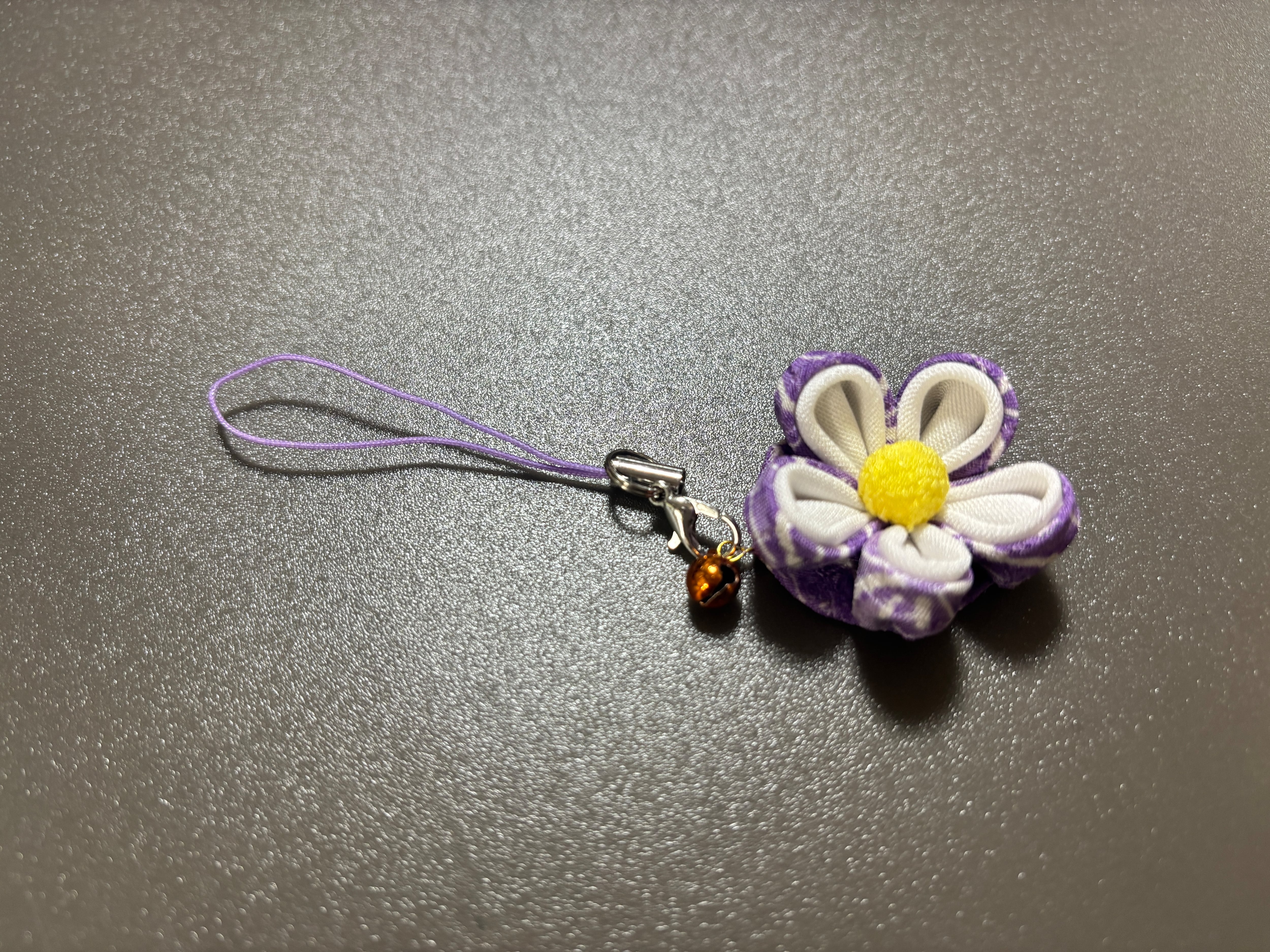 手挿し江戸紅型染めによる、華やかな花形のデザインが特徴のつまみ細工の根付です。白ちりめん生地と薄紫色の紬を使用し、柔らかな色合いが優美さを引き立てます。この根付は、日常のスタイルに個性的なアクセントを加えたり、特別な場面であなたの魅力を際立てるアイテムです。根付パーツを付けると帯にも挟めます。