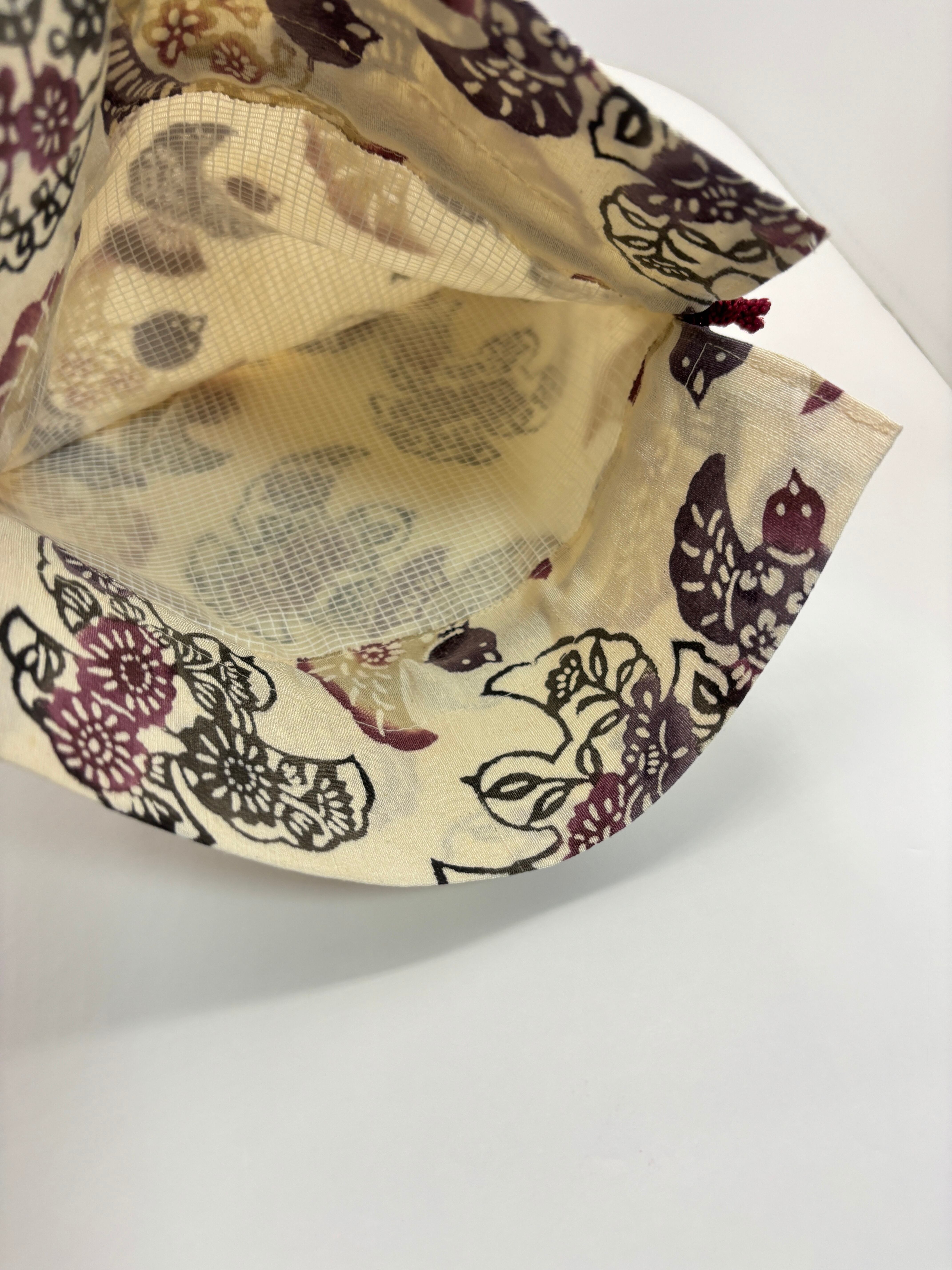 手挿し江戸紅型染めの技術を用いた、福良雀柄の美しい巾着です。優しい配色が特長で、ちょっとしたお出かけやお散歩にぴったりのサイズ感が魅力です。かわいらしいデザインは、日常のシーンに華を添えることでしょう。