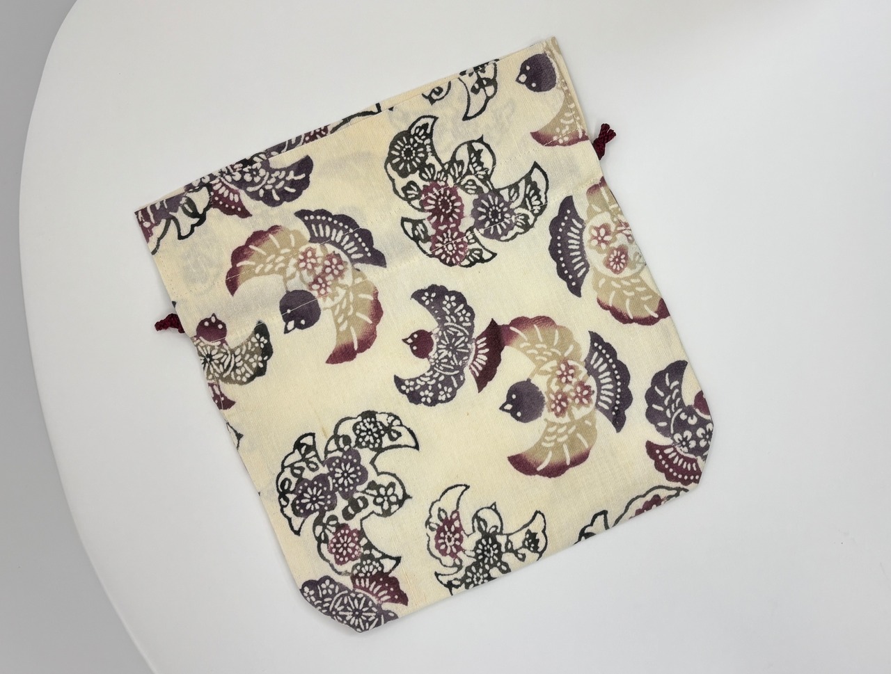 日本の伝統的な染め技術が感じられるこの巾着は、福良雀柄が日常を楽しく彩り、豊かな色合いが心温まるひとときをお届けします。