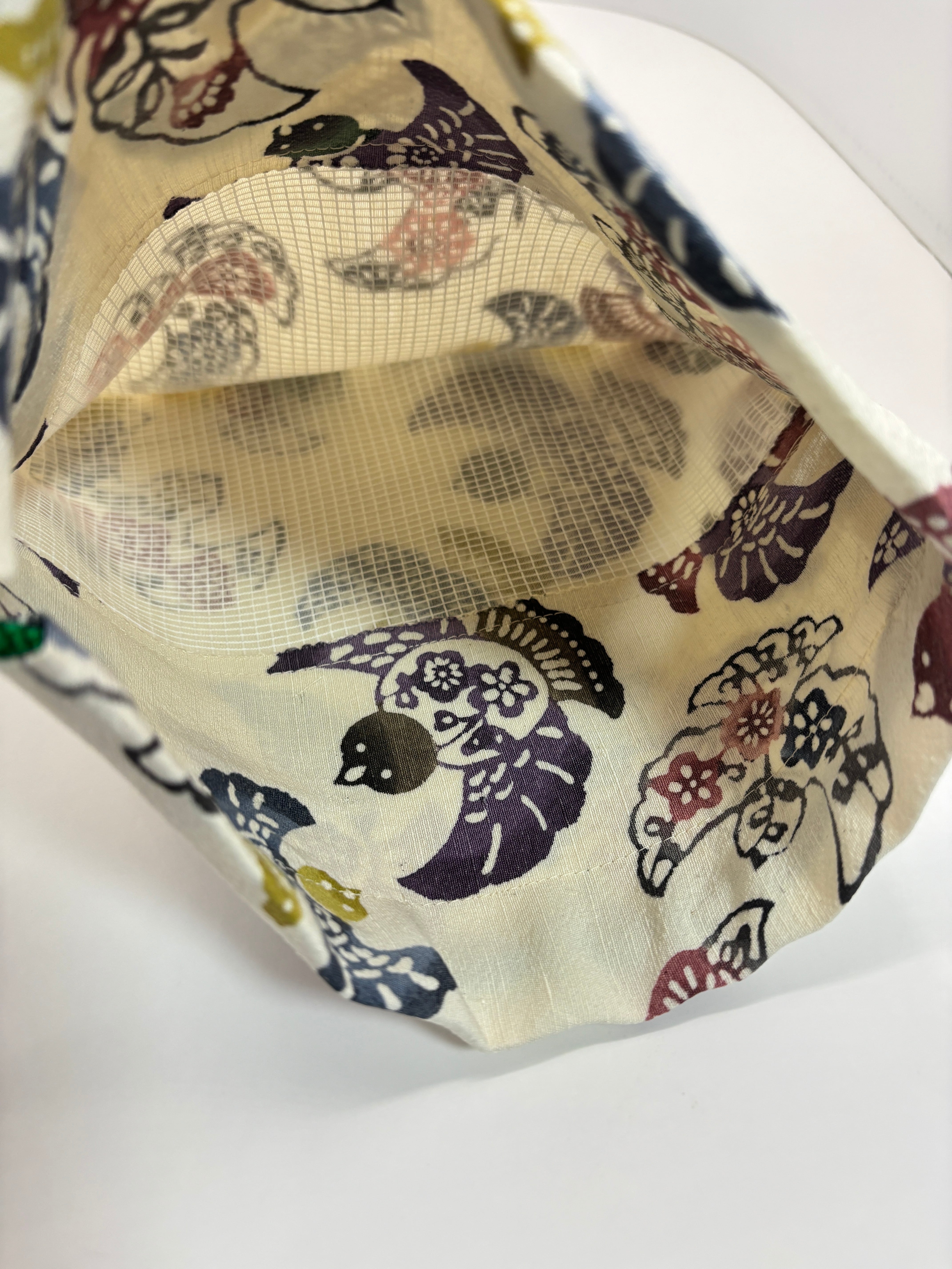 手挿し江戸紅型染めで仕立てられた、福良雀柄の美しい巾着です。豊かな色合いが魅力で、ひだのないスマートなデザインは、バックインバックとしても最適です。日常のシーンや特別な瞬間、どんな場面でもお楽しみいただけるアイテムです。このデザインが、あなたのライフスタイルに素晴らしい彩りを添えることでしょう!
