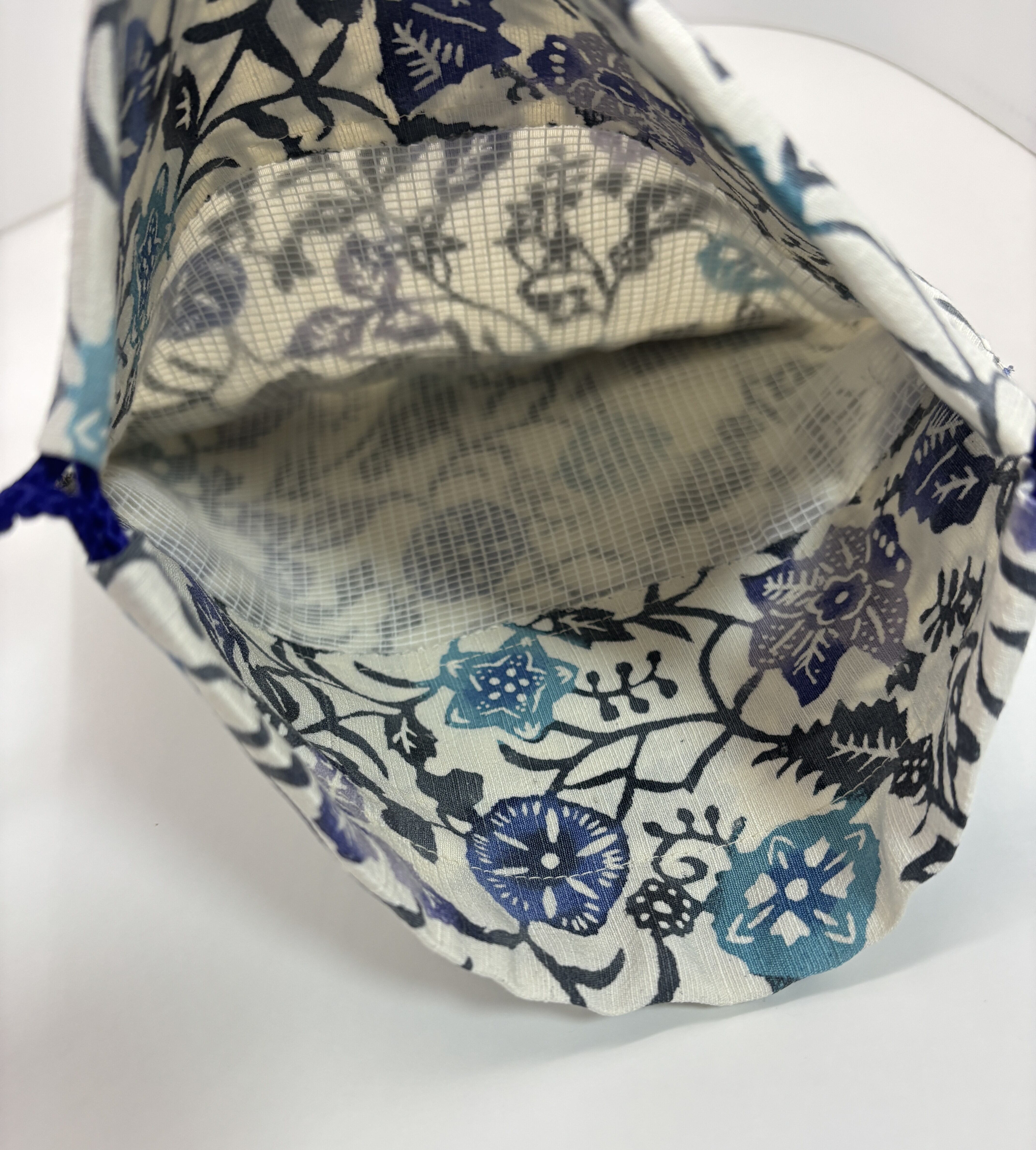 手挿し江戸紅型染めを施した、結城紬製の巾着です。更紗調の柄が際立つ藍系の色合いは、すっきりとした印象を与え、シーンを選ばずご使用いただけます。ひだのないデザインは、シンプルでコンパクトに持ち運ぶことができ、バックインバックとしてもおすすめです。この巾着が、あなたのライフスタイルに素敵な彩りを添えてくれることでしょう!